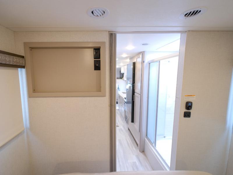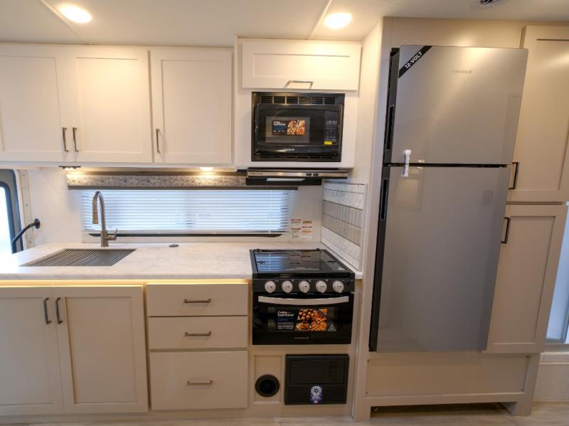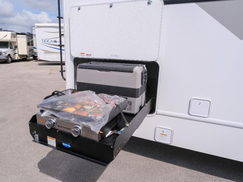 You're sure to have a great time in this coach that can sleep six each night! The rear bedroom includes an RV queen bed and dual closets to keep your things organized, plus the bath is close by for easy nighttime use. Here, you'll find a private toilet and sink, with the independent shower right across the hall. Your guests can sleep on the 70" dream dinette within the large slide out, or the cab-over bunk up front! A three burner gas cooktop and microwave oven will let you make meals for your crew, and a 12V refrigerator will keep perishables fresh. This unit also includes an exterior kitchen, allowing you to cook in the open fresh air!