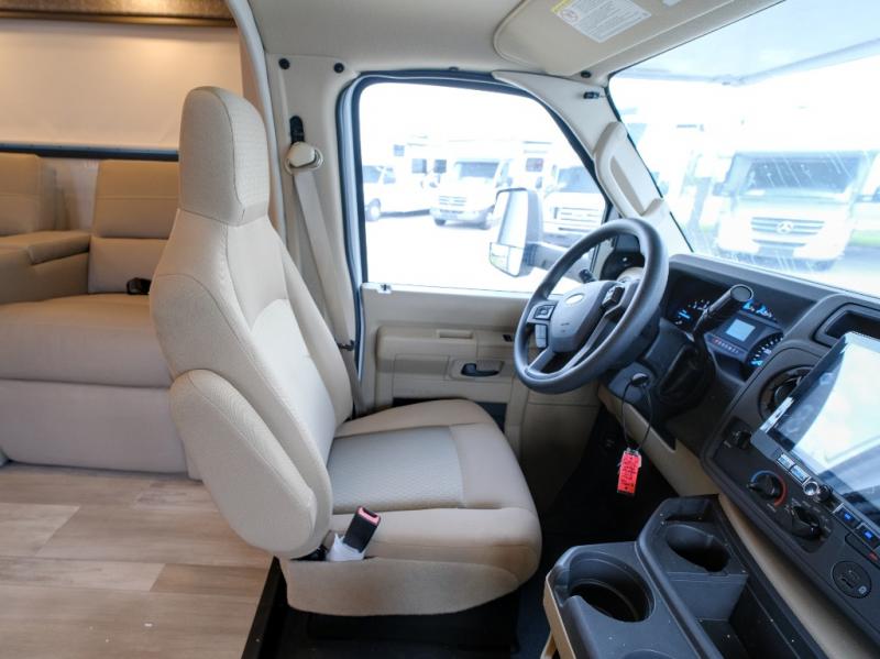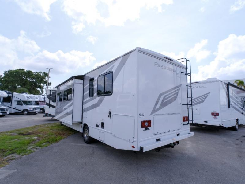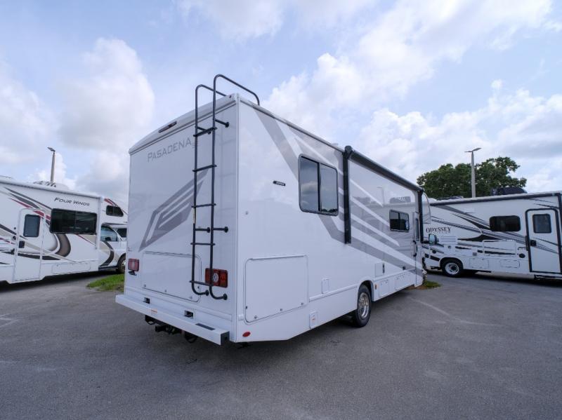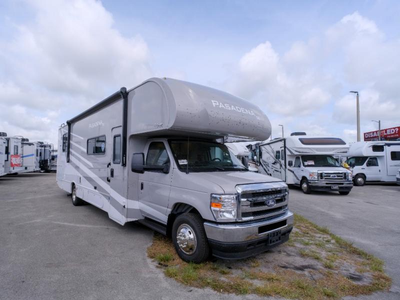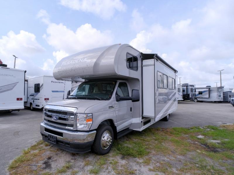 With any Pasadena SE Class C gas motorhome by Thor Motor Coach, you will find convenient amenities, a modern interior, and a reliable Ford E-Series chassis on select models to power your adventures. There is a one-piece fiberglass front cap, and premium one-piece roofing for added strength. Residential vinyl flooring will be easy to keep clean, and you'll love the LED lighting, pressed laminate countertops throughout, and full-extensions ball-bearing drawer guides. These motorhomes also include a generator and a 30-amp shoreline power cord to keep you going, along with a tankless water heater to ensure your comfort!