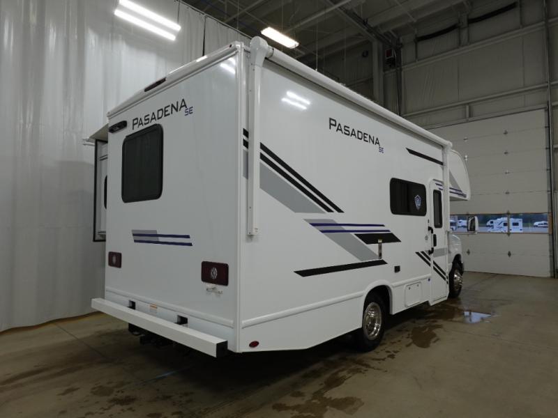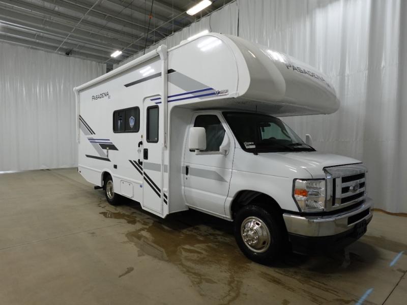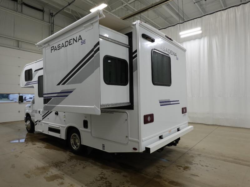 With any Pasadena SE Class C gas motorhome by Thor Motor Coach, you will find convenient amenities, a modern interior, and a reliable Ford E-Series chassis on select models to power your adventures. There is a one-piece fiberglass front cap, and premium one-piece roofing for added strength. Residential vinyl flooring will be easy to keep clean, and you'll love the LED lighting, pressed laminate countertops throughout, and full-extensions ball-bearing drawer guides. These motorhomes also include a generator and a 30-amp shoreline power cord to keep you going, along with a tankless water heater to ensure your comfort!