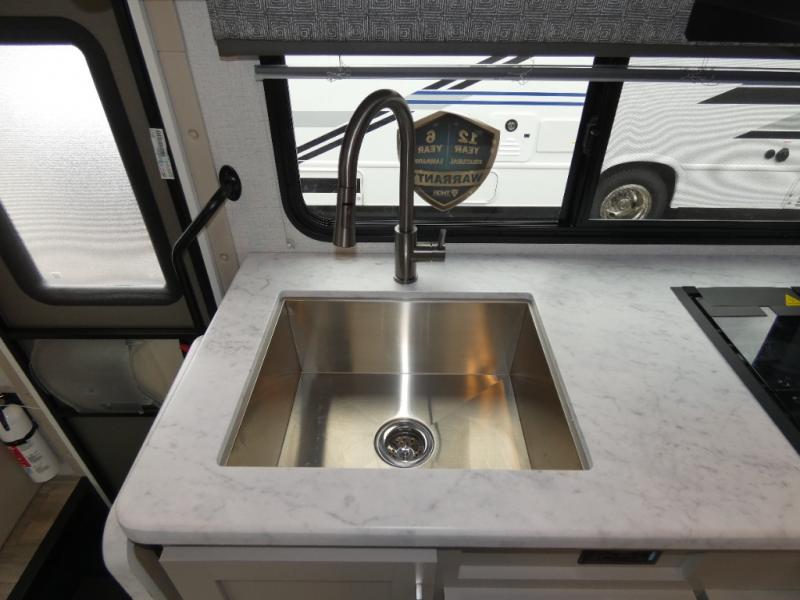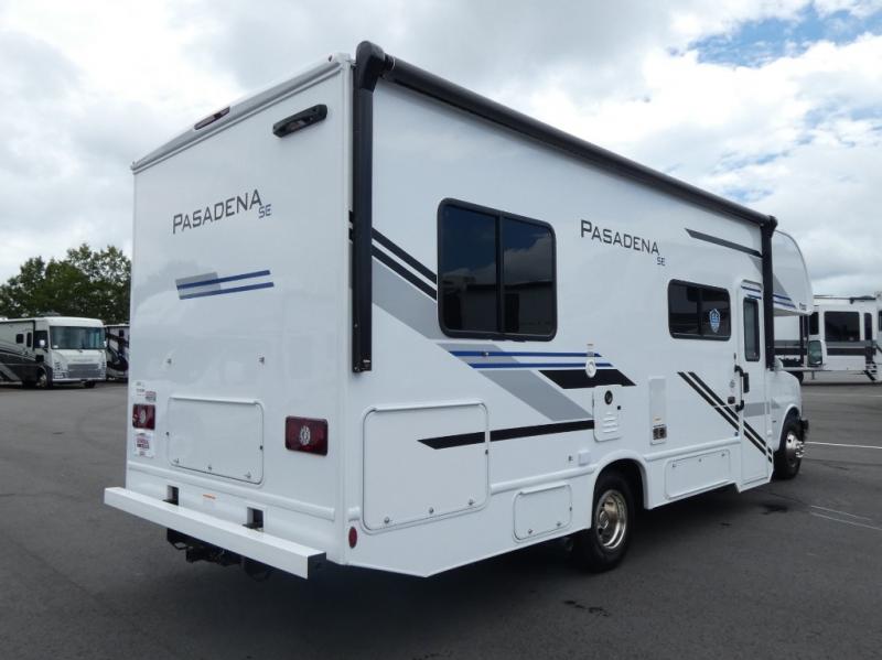 With any Pasadena SE Class C gas motorhome by Thor Motor Coach, you will find convenient amenities, a modern interior, and a reliable Chevy chassis. There is a one-piece fiberglass front cap, and premium one-piece roofing for added strength. Residential vinyl flooring will be easy to keep clean, and you'll love the LED lighting, pressed laminate countertops throughout, and full-extensions ball-bearing drawer guides. These motorhomes also include a generator and a 30-amp shoreline power cord to keep you going, along with a tankless water heater to ensure your comfort!