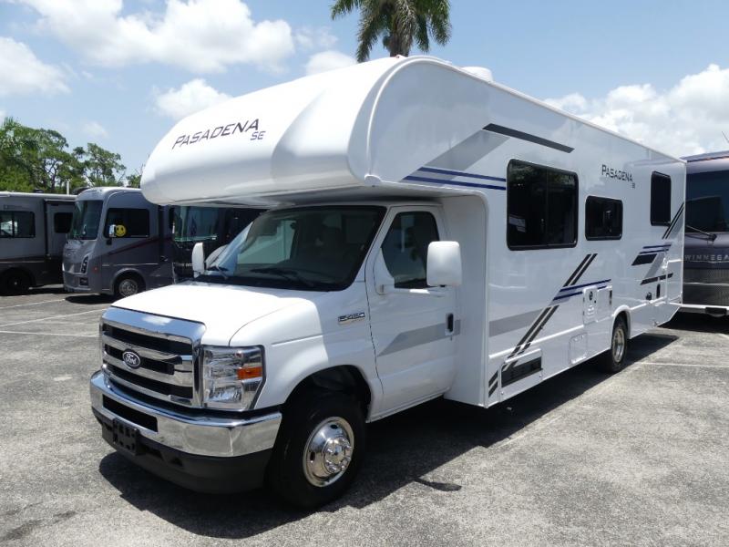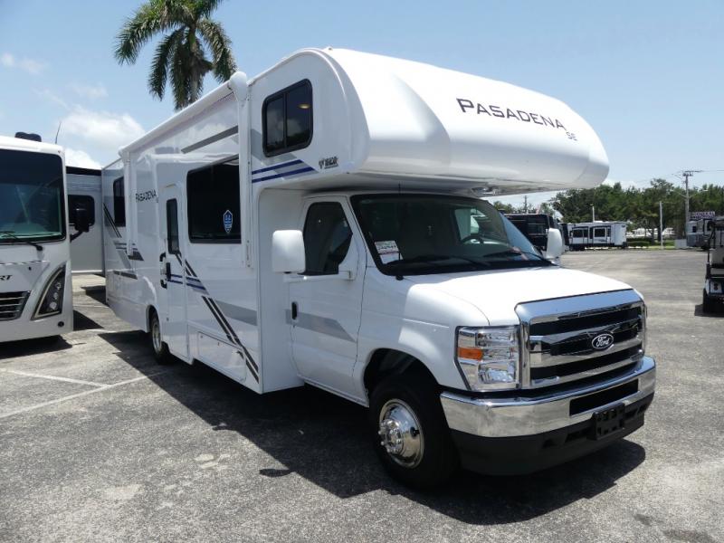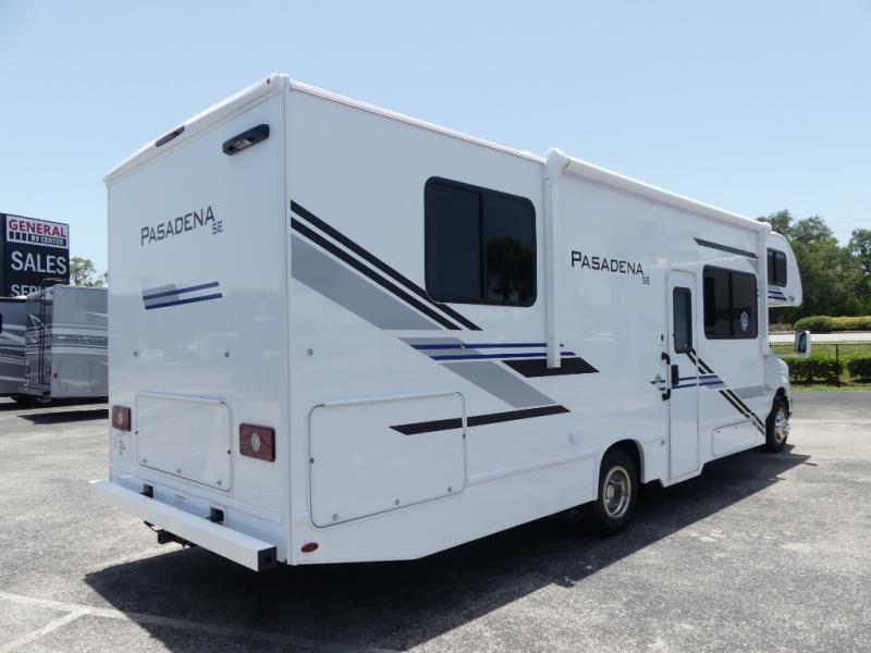With any Pasadena SE Class C gas motorhome by Thor Motor Coach, you will find convenient amenities, a modern interior, and a reliable Ford E-Series chassis, with an optional Chevy chassis on select models to power your adventures. There is a one-piece fiberglass front cap, and premium one-piece roofing for added strength. Residential vinyl flooring will be easy to keep clean, and you'll love the LED lighting, pressed laminate countertops throughout, and full-extensions ball-bearing drawer guides. These motorhomes also include a generator and a 30-amp shoreline power cord to keep you going, along with a tankless water heater to ensure your comfort!