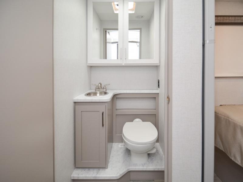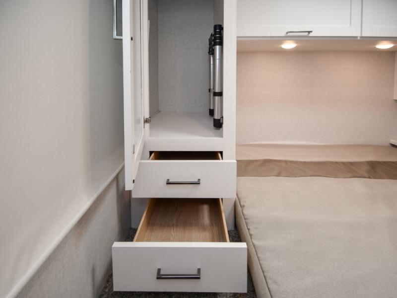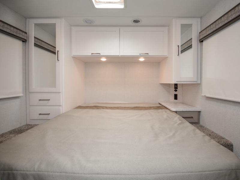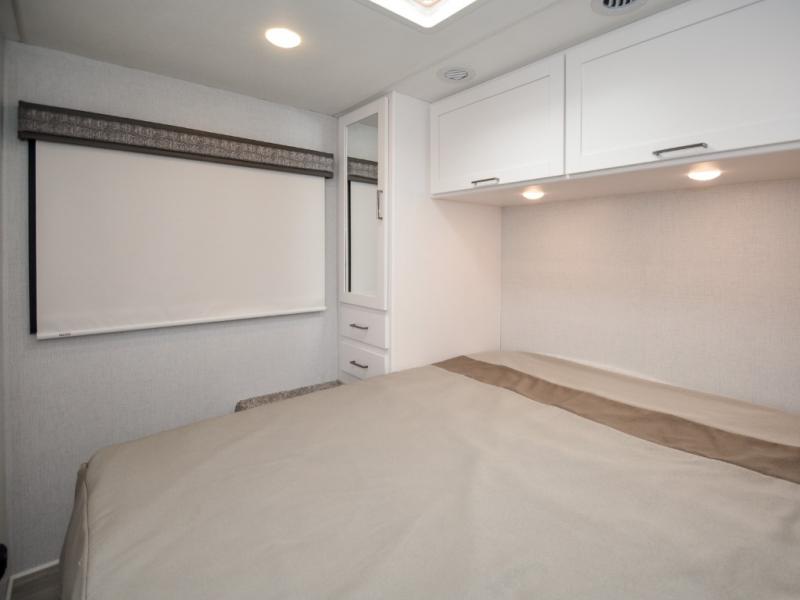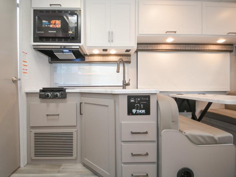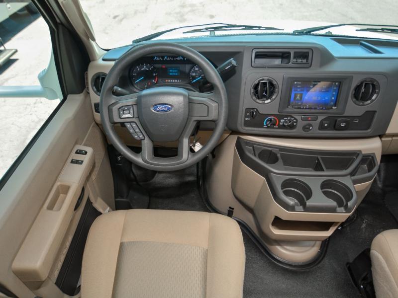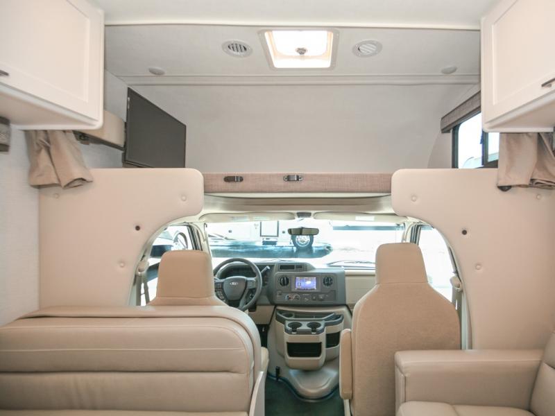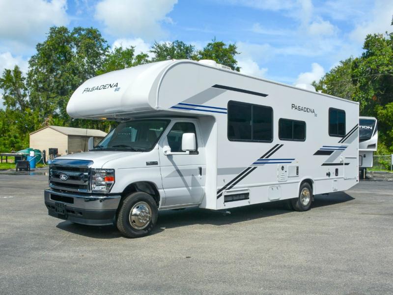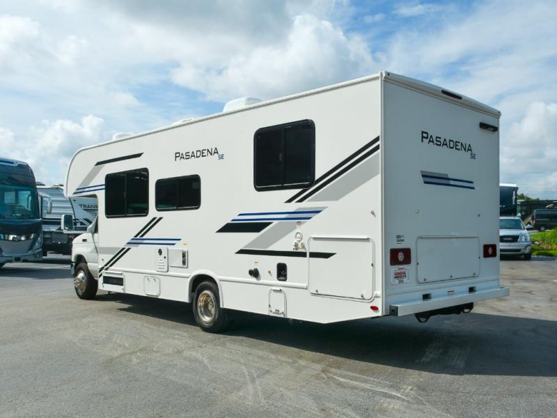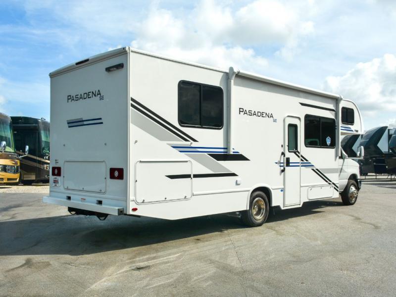 With any Pasadena SE Class C gas motorhome by Thor Motor Coach, you will find convenient amenities, a modern interior, and a reliable Ford E-Series chassis on select models to power your adventures. There is a one-piece fiberglass front cap, and premium one-piece roofing for added strength. Residential vinyl flooring will be easy to keep clean, and you'll love the LED lighting, pressed laminate countertops throughout, and full-extensions ball-bearing drawer guides. These motorhomes also include a generator and a 30-amp shoreline power cord to keep you going, along with a tankless water heater to ensure your comfort!