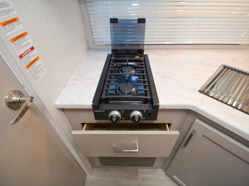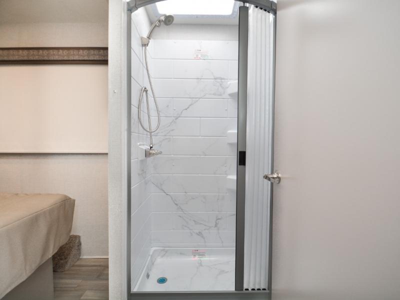 You're sure to have a great time in this coach that can sleep six each night! The rear bedroom includes an RV queen bed and dual closets to keep your things organized, plus the bath is close by for easy nighttime use. Here, you'll find a private toilet and sink, with the independent shower right across the hall. Your guests can sleep on the 68" sofa, 70" dream dinette, or the cab-over bunk! A two burner gas cooktop and convection microwave with an air fryer will let you make meals for your crew, and a 12V refrigerator will keep perishables fresh.