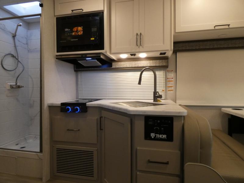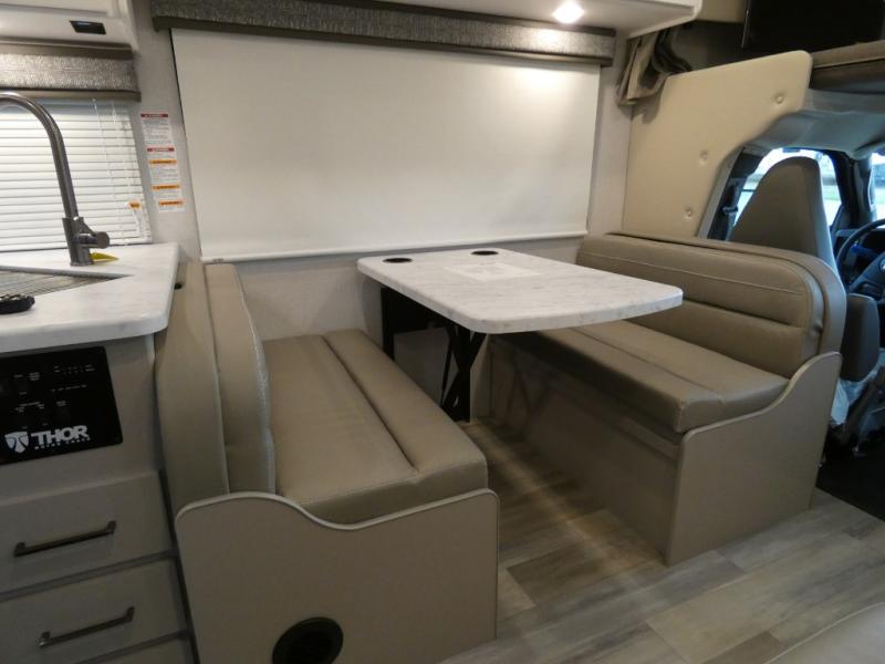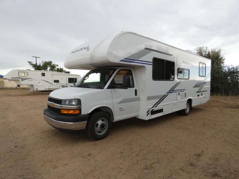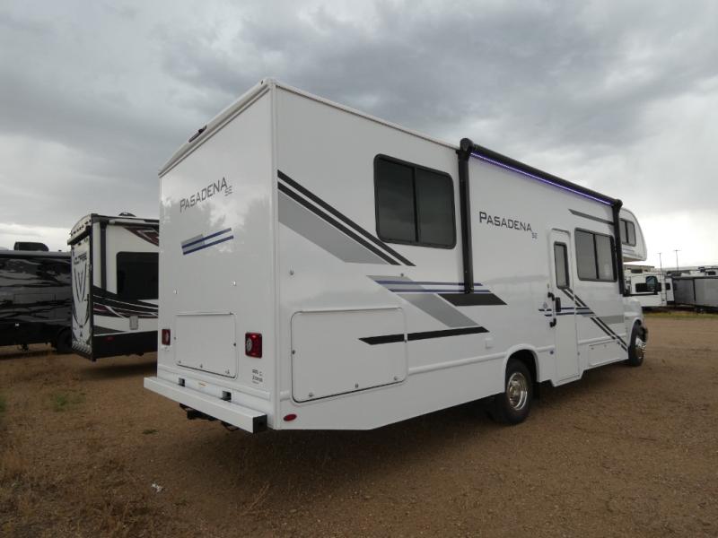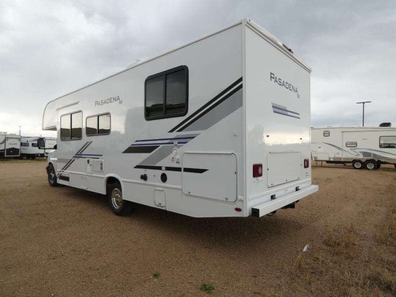 With any Pasadena SE Class C gas motorhome by Thor Motor Coach, you will find convenient amenities, a modern interior, and a reliable Chevy chassis. There is a one-piece fiberglass front cap, and premium one-piece roofing for added strength. Residential vinyl flooring will be easy to keep clean, and you'll love the LED lighting, pressed laminate countertops throughout, and full-extensions ball-bearing drawer guides. These motorhomes also include a generator and a 30-amp shoreline power cord to keep you going, along with a tankless water heater to ensure your comfort!