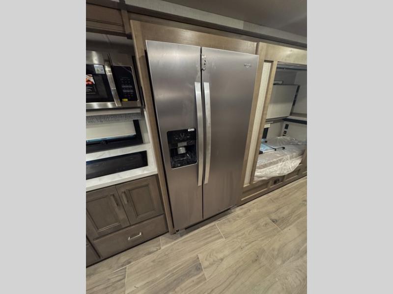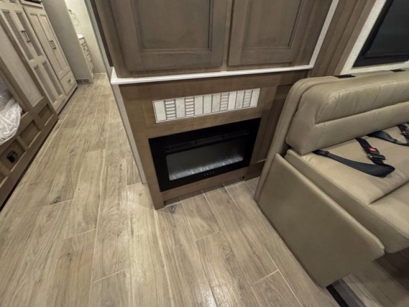 Relax in style with 68" upgraded Villa theater seating across from the electric fireplace and entertainment center. Porcelain tile flooring runs throughout the coach, and real hardwood cabinetry (no wrapped stiles) enhances durability and upscale appeal.