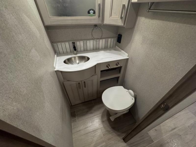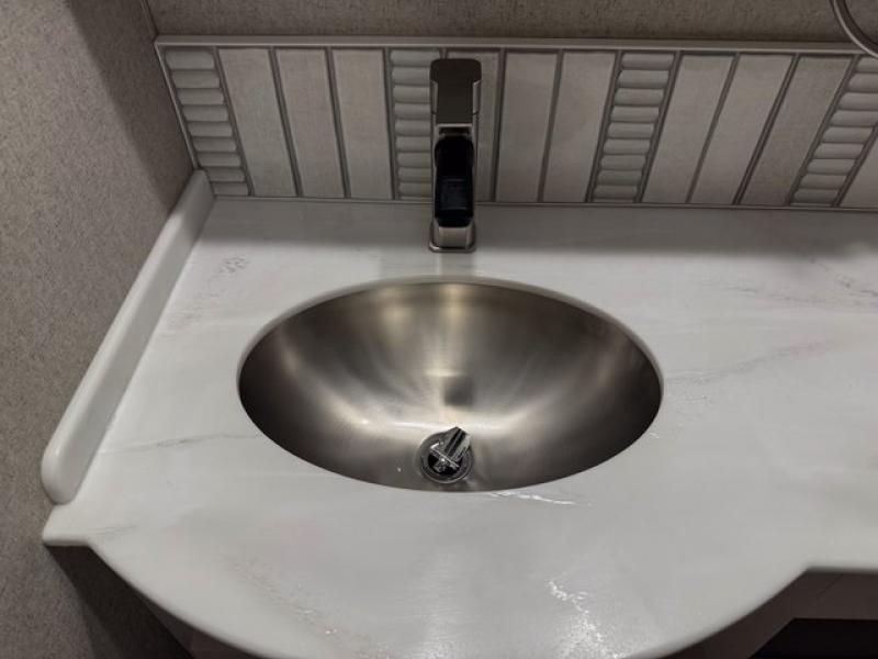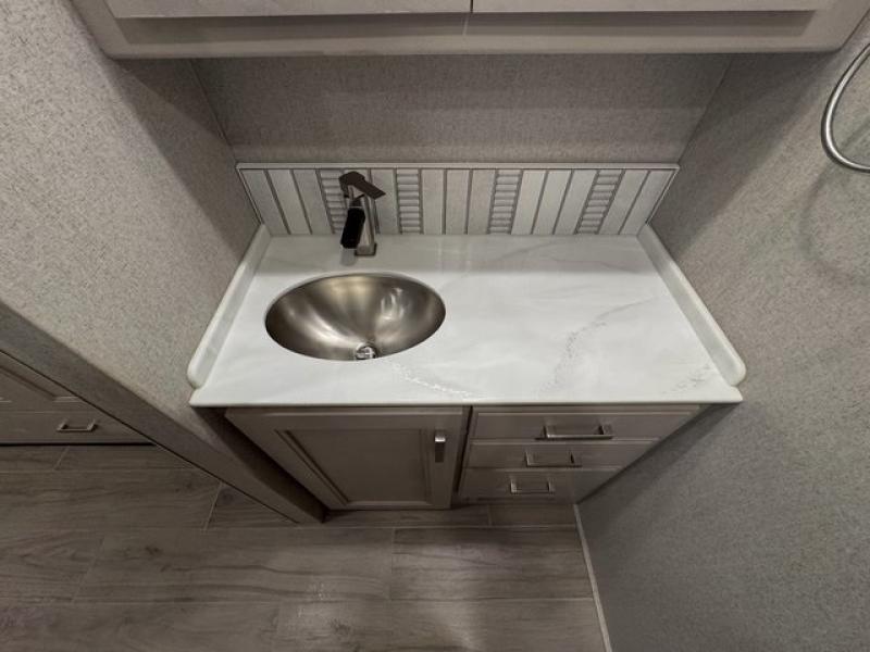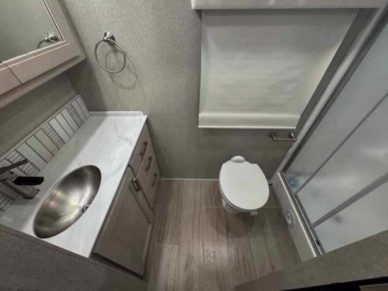 The highly sought-after bath-and-a-half layout makes traveling with family or guests comfortable and convenient. The mid-coach half bath keeps traffic out of the master suite, while the full rear bathroom offers a spacious, spa-like retreat.