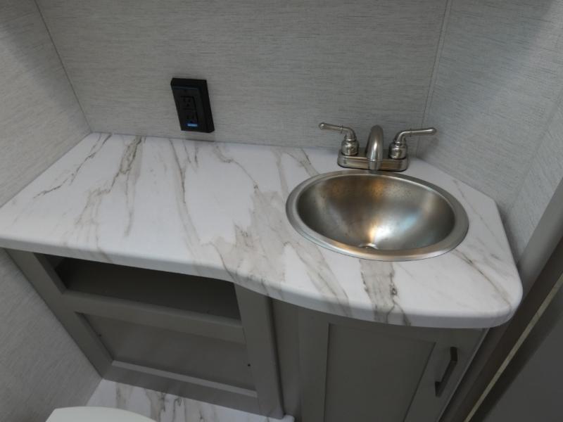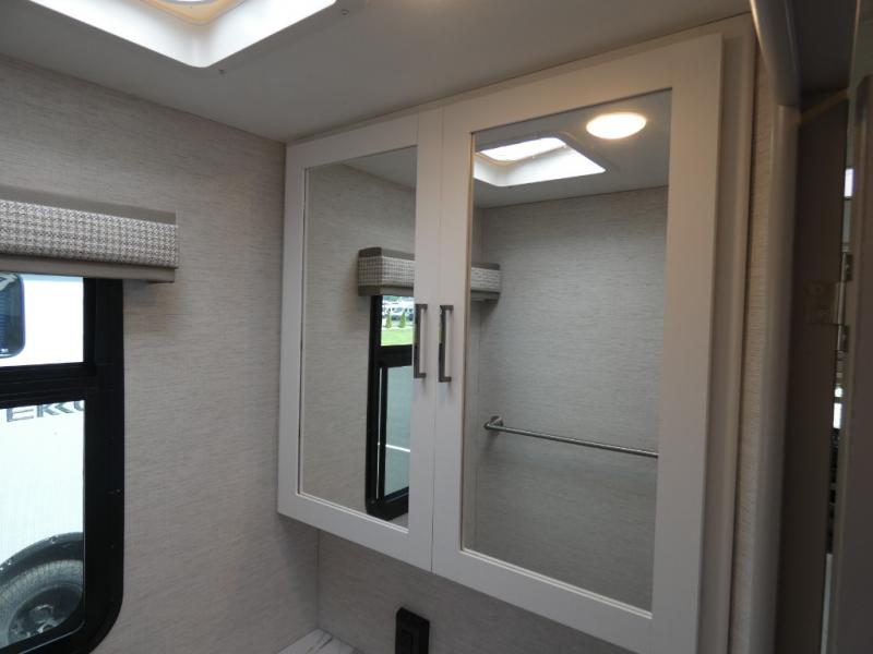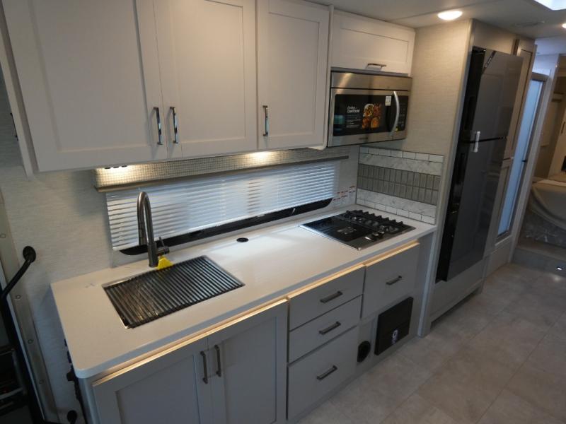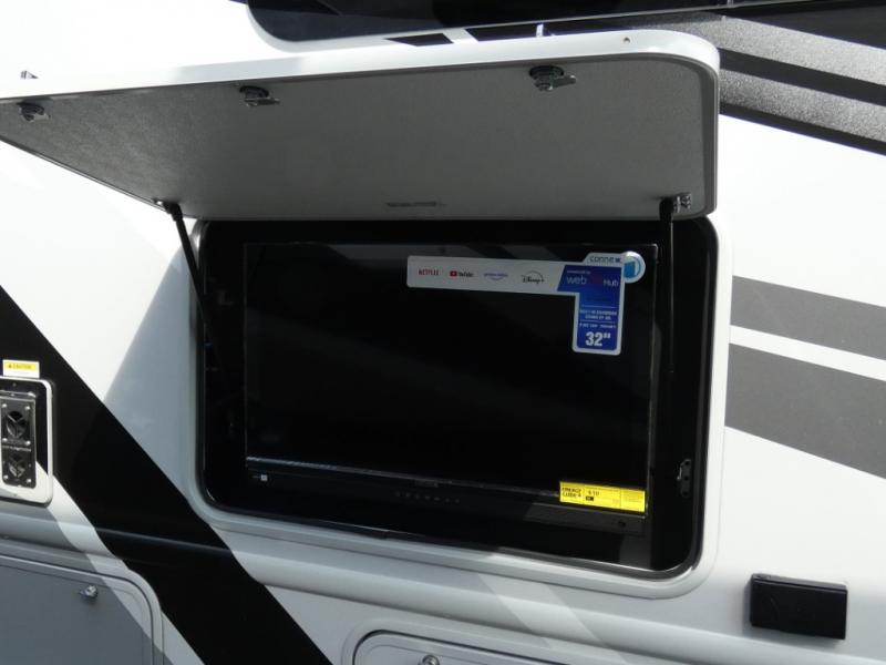Head across the state or country in this spacious coach for five to six! The cab-over bunk area features a 52" x 96" sleeping area, plus a built-in skylight and a 40" Smart TV on swivel to enjoy movie nights. Your crew can relax on the jack-knife sofa and dream dinette while the chef of your group is making lunch on the two burner gas cooktop with a single induction cooktop. The full bath features a 24" x 36" shower, with the toilet and sink across the hall, and the door can shut off the toilet if two people are needing to use this space at once. Head to the rear private bedroom where you'll find an RV queen bed and dual bedside closets to keep your things organized.