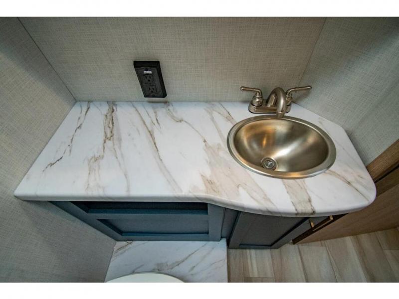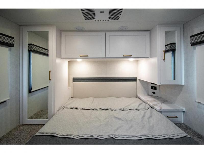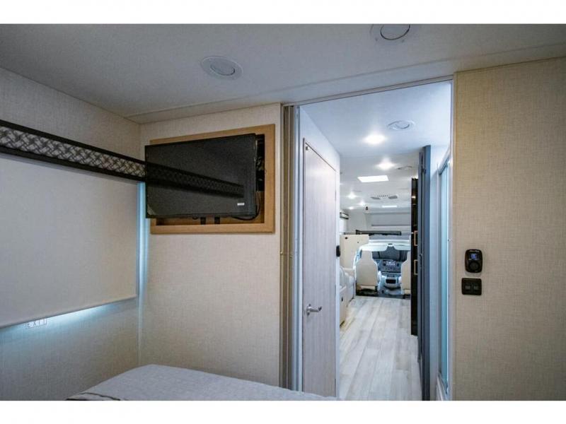 Head across the state or country in this spacious coach for five to six! The cab-over bunk area features a 52" x 96" sleeping area, plus a built-in skylight and a 40" Smart TV on swivel to enjoy movie nights. Your crew can relax on the jack-knife sofa and dream dinette while the chef of your group is making lunch on the two burner gas cooktop with a single induction cooktop. The full bath features a 24" x 36" shower, with the toilet and sink across the hall, and the door can shut off the toilet if two people are needing to use this space at once. Head to the rear private bedroom where you'll find an RV queen bed and dual bedside closets to keep your things organized.