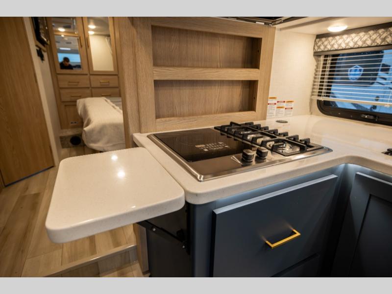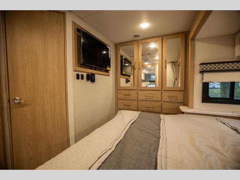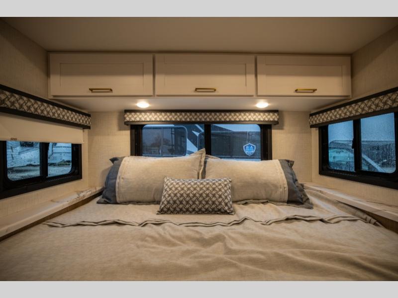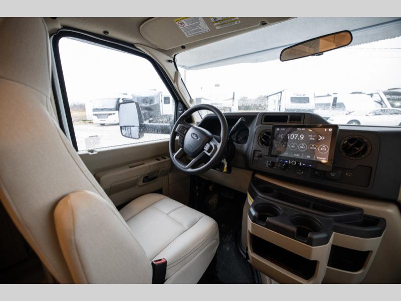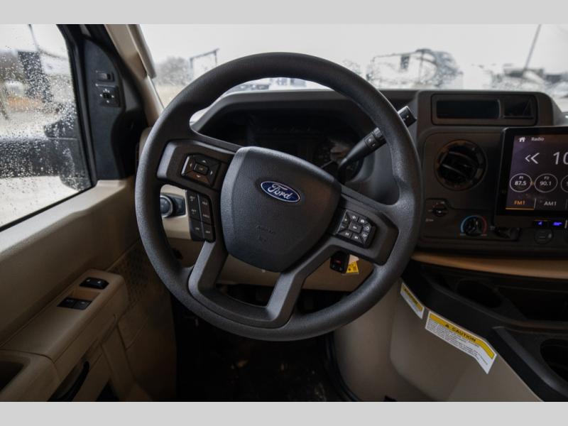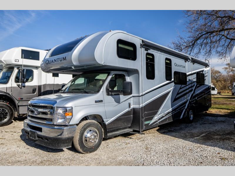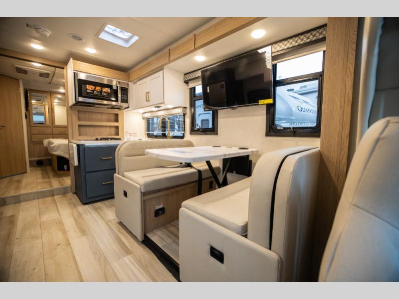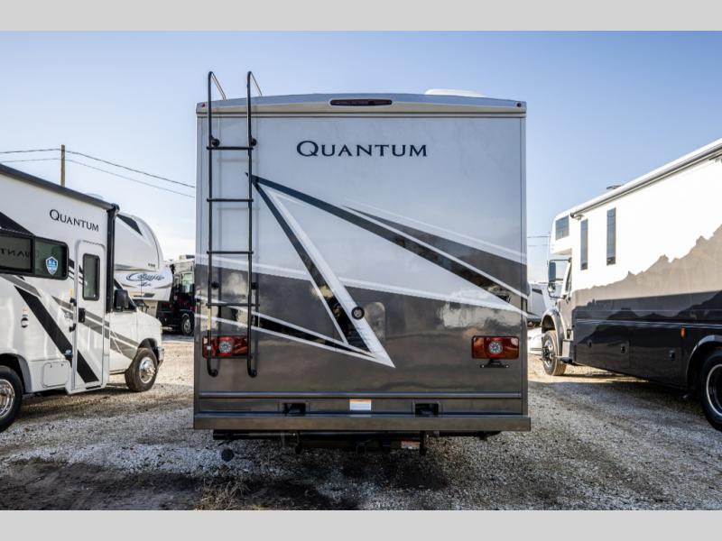 With any Quantum Class C gas motorhome by Thor Motor Coach, you will find a welded tubular aluminum roof and sidewall cage construction, plus a fiberglass front cap with a skylight and power shade for added privacy. The interior offers residential vinyl flooring, Leatherette furniture, and full extension soft close metal ball-bearing drawer guides. The driver is sure to appreciate the touchscreen dash radio and back-up monitor to make maneuvering in and out of campgrounds easier than ever. A 4.0kW gas generator and 30-amp shoreline power cord will provide the power you need for your adventures, and the 100-watt solar charging system with a power controller will provide off-grid capabilities.