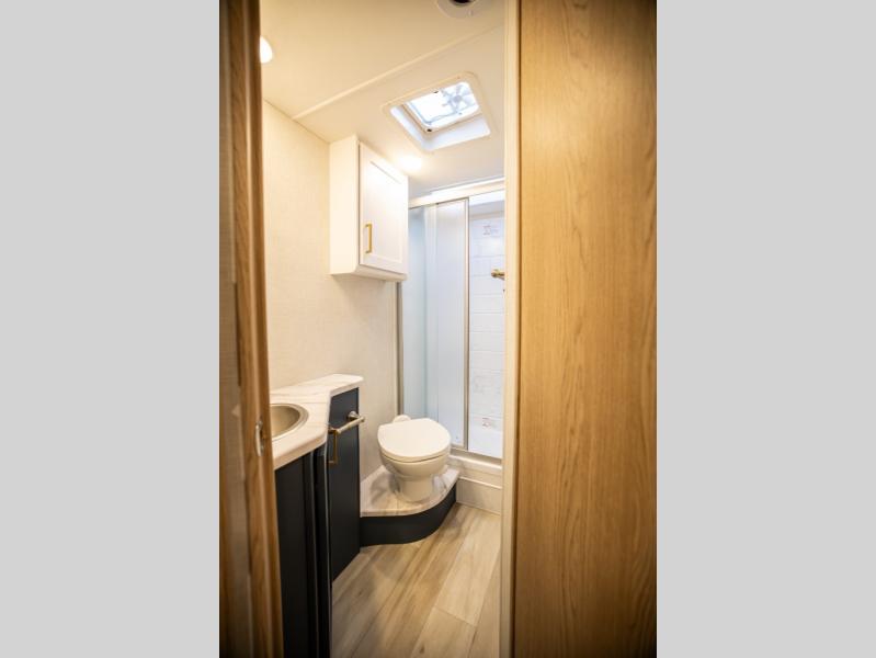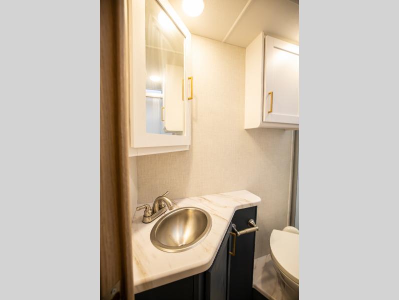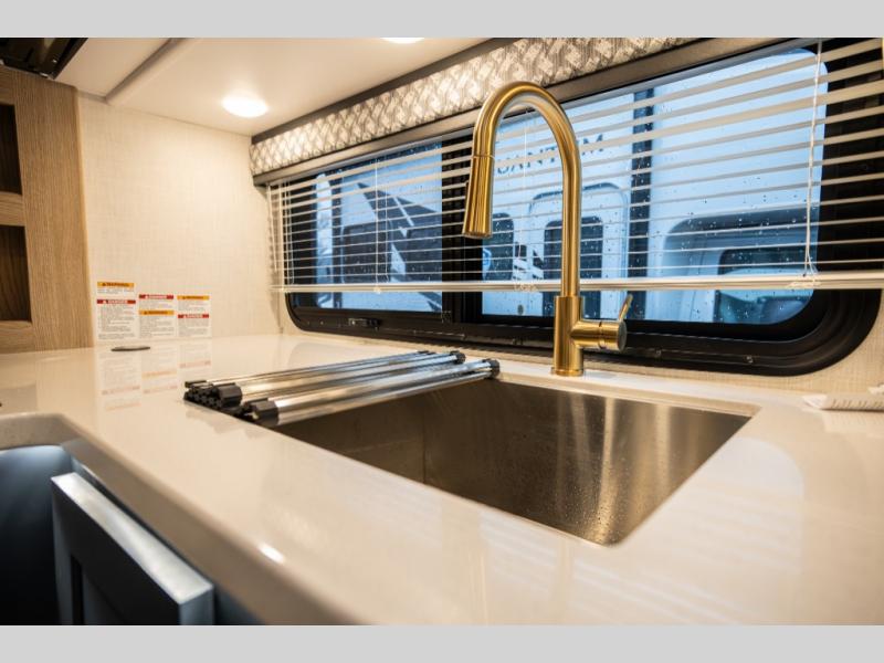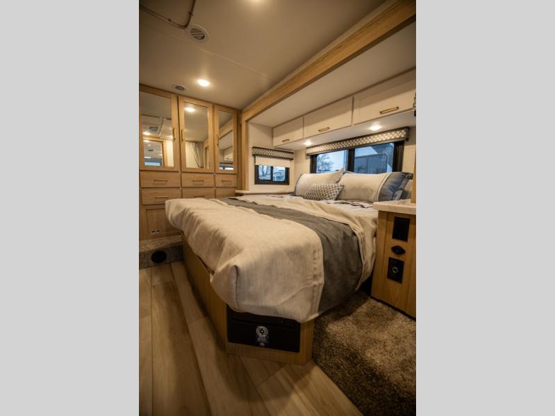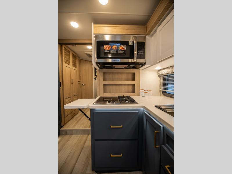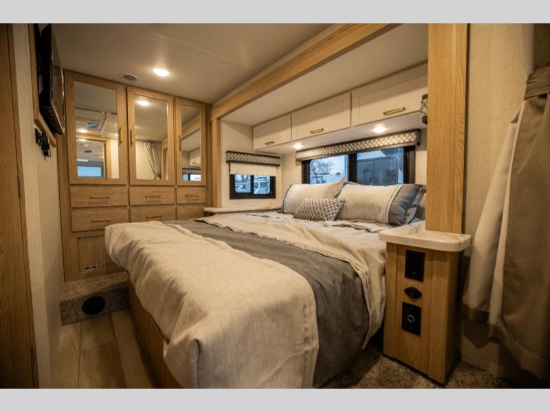 You're going to love this coach with a rear corner bedroom and easy access to the full bath. There is a privacy curtain to close off the bedroom if you're traveling with guests, and the full bath will let you clean up each day. The mid-coach entry gets you inside quickly with easy access to the refrigerator or the jack-knife sofa, and the slide out in this area offers a 70" Dream dinette and an L-shaped counter. There is also a convection microwave overhead and a stainless steel sink plus a flip-up countertop extension for more prepping space when cooking. The kids or your guests can sleep on the cab-over bunk or any furniture once converted. The built-in skylight over the cab will be great for added light from the moon at night or sun during the day. And the exterior offers a 32" TV to enjoy while outdoors.