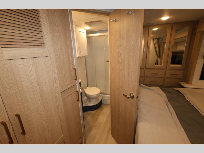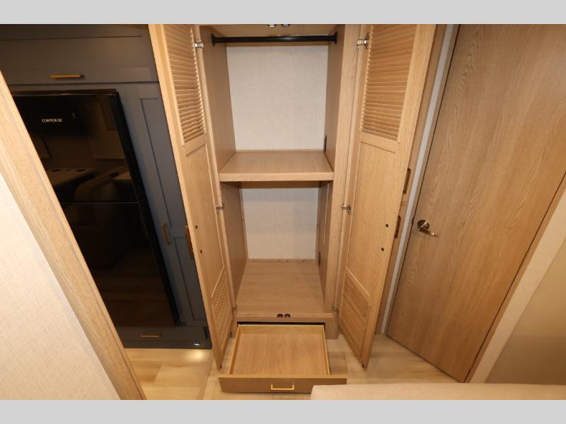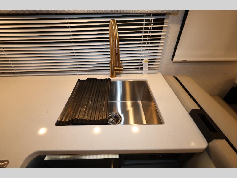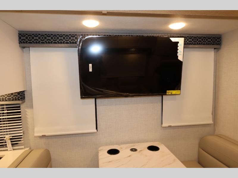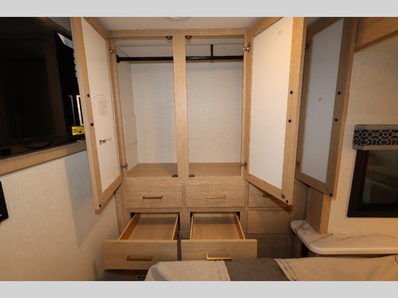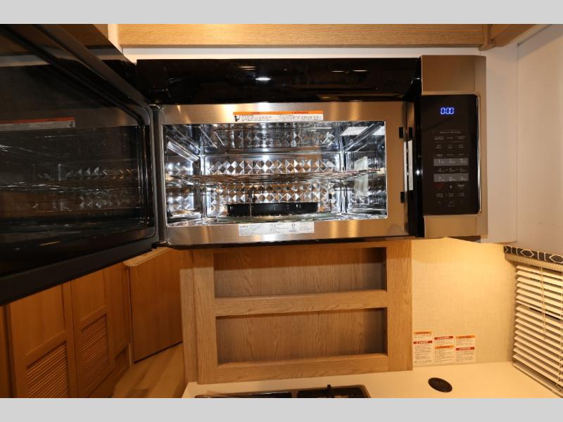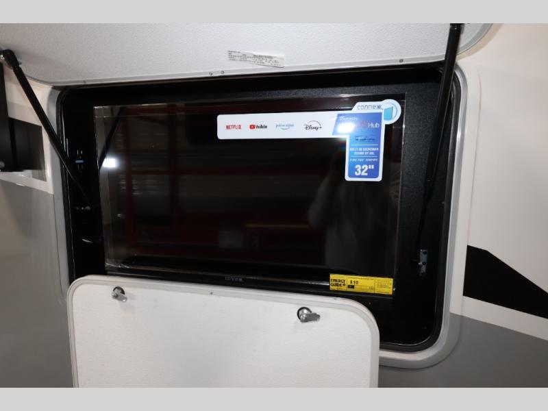 You're going to love this coach with a rear corner bedroom and easy access to the full bath. There is a privacy curtain to close off the bedroom if you're traveling with guests, and the full bath will let you clean up each day. The mid-coach entry gets you inside quickly with easy access to the refrigerator or the jack-knife sofa, and the slide out in this area offers a 70" Dream dinette and an L-shaped counter. There is also a convection microwave overhead and a stainless steel sink plus a flip-up countertop extension for more prepping space when cooking. The kids or your guests can sleep on the cab-over bunk or any furniture once converted. The built-in skylight over the cab will be great for added light from the moon at night or sun during the day. And the exterior offers a 32" TV to enjoy while outdoors.