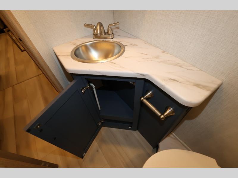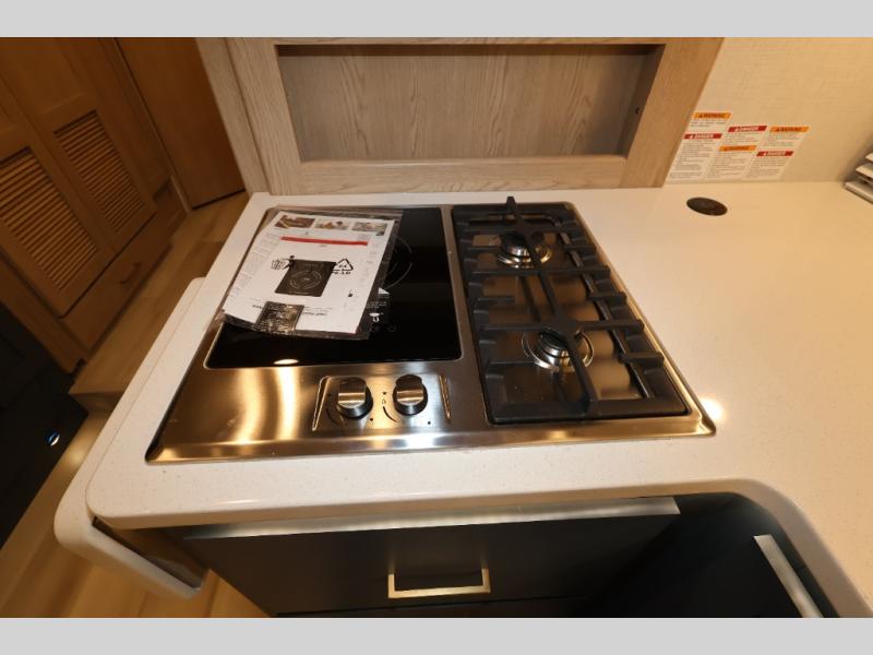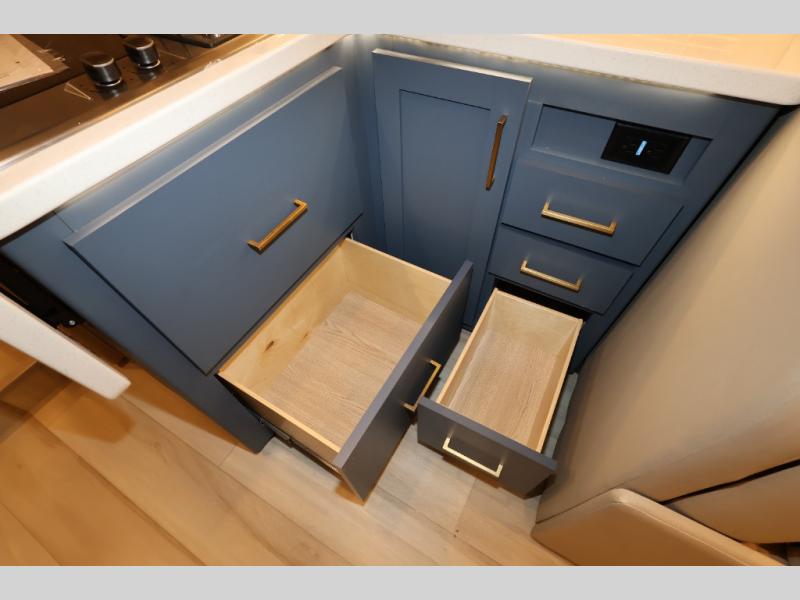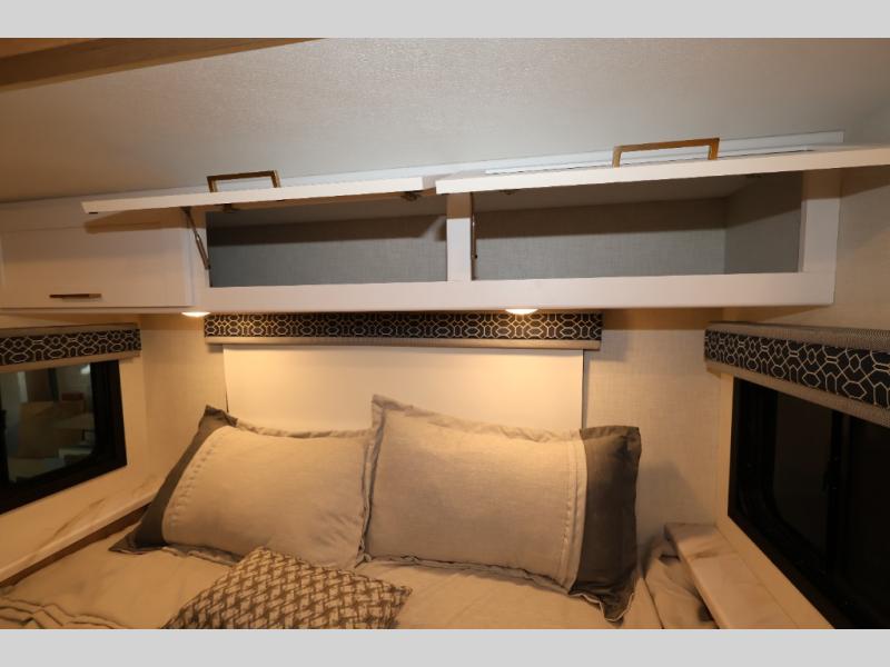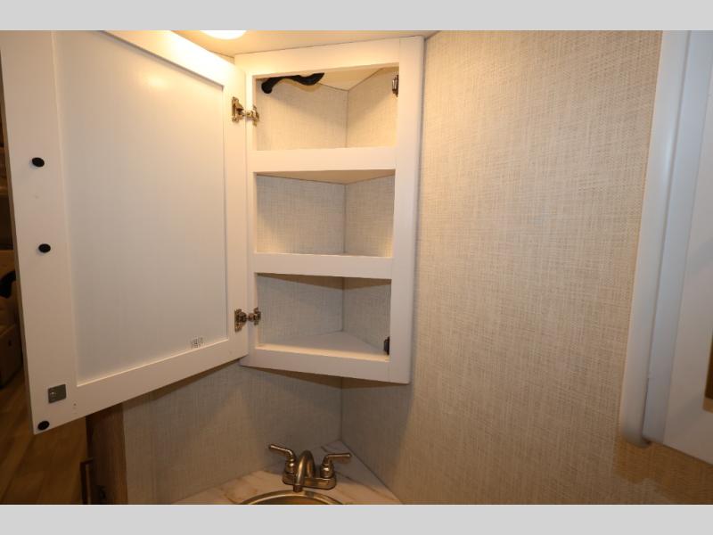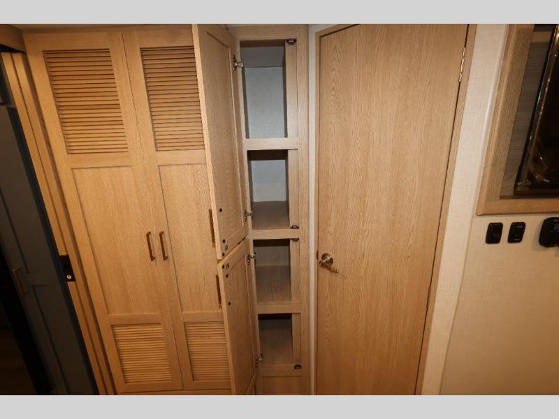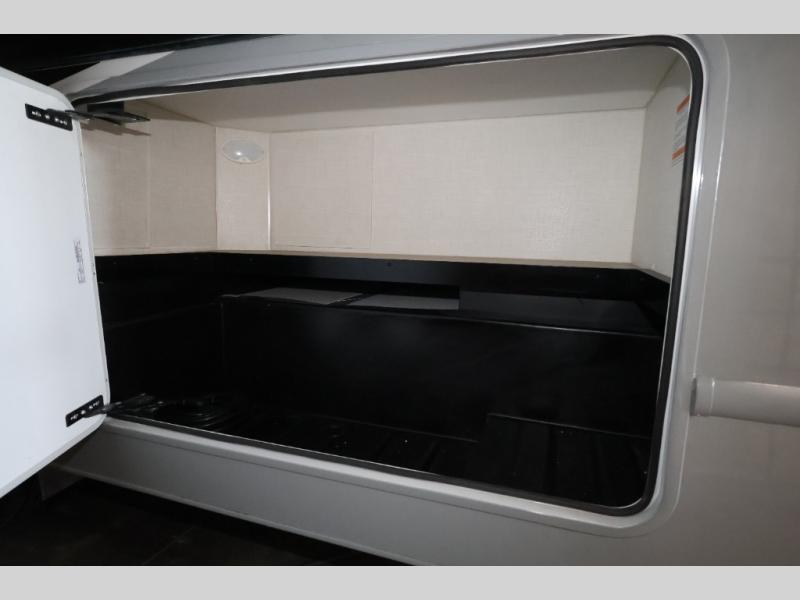 You're going to love this coach with a rear corner bedroom and easy access to the full bath. There is a privacy curtain to close off the bedroom if you're traveling with guests, and the full bath will let you clean up each day. The mid-coach entry gets you inside quickly with easy access to the refrigerator or the jack-knife sofa, and the slide out in this area offers a 70" Dream dinette and an L-shaped counter. There is also a convection microwave overhead and a stainless steel sink plus a flip-up countertop extension for more prepping space when cooking. The kids or your guests can sleep on the cab-over bunk or any furniture once converted. The built-in skylight over the cab will be great for added light from the moon at night or sun during the day. And the exterior offers a 32" TV to enjoy while outdoors.