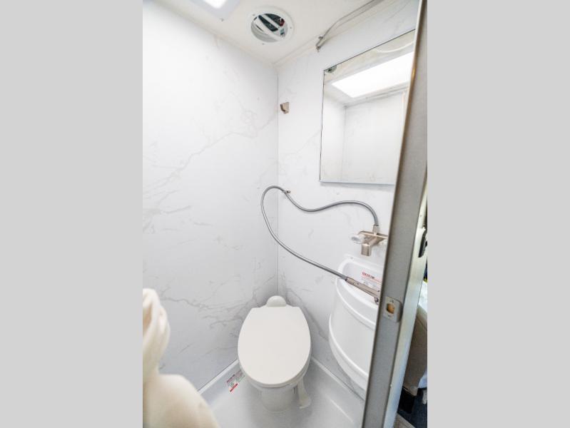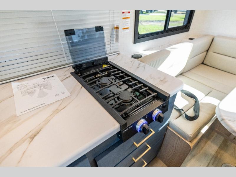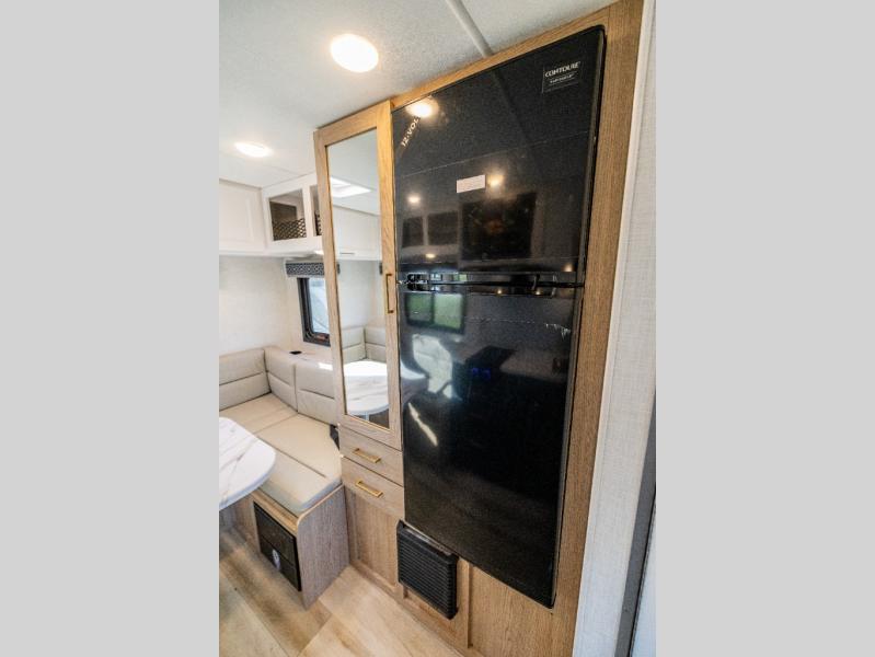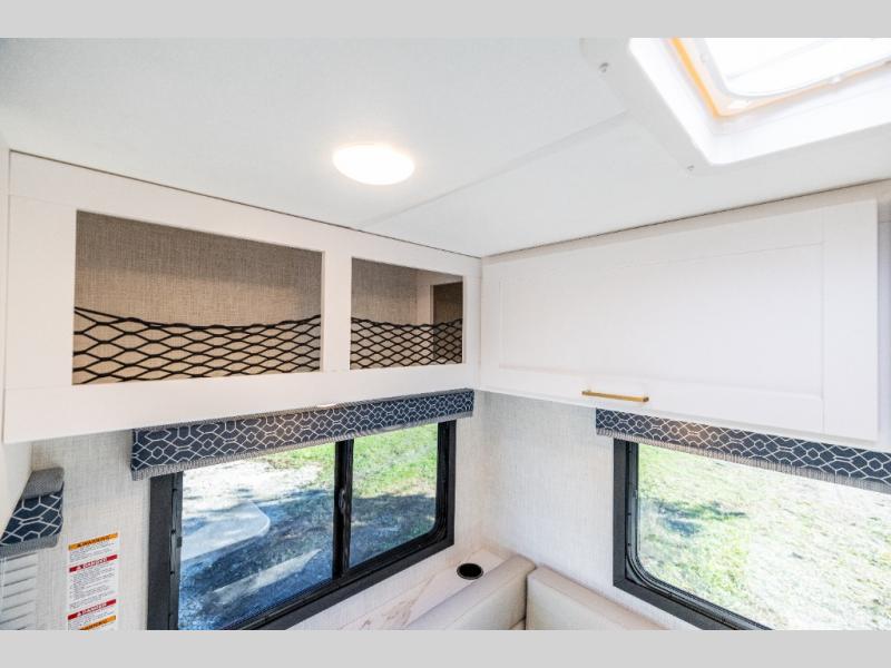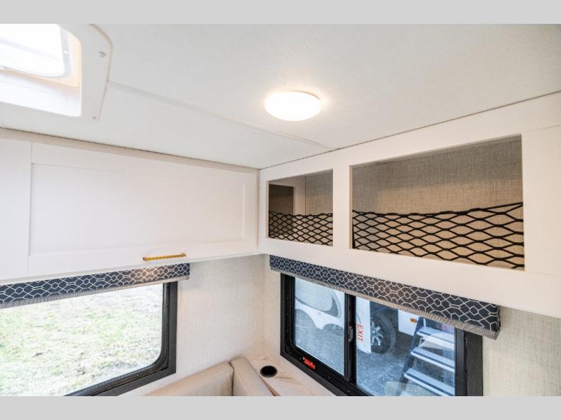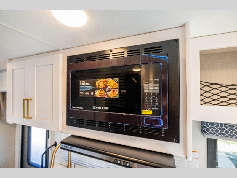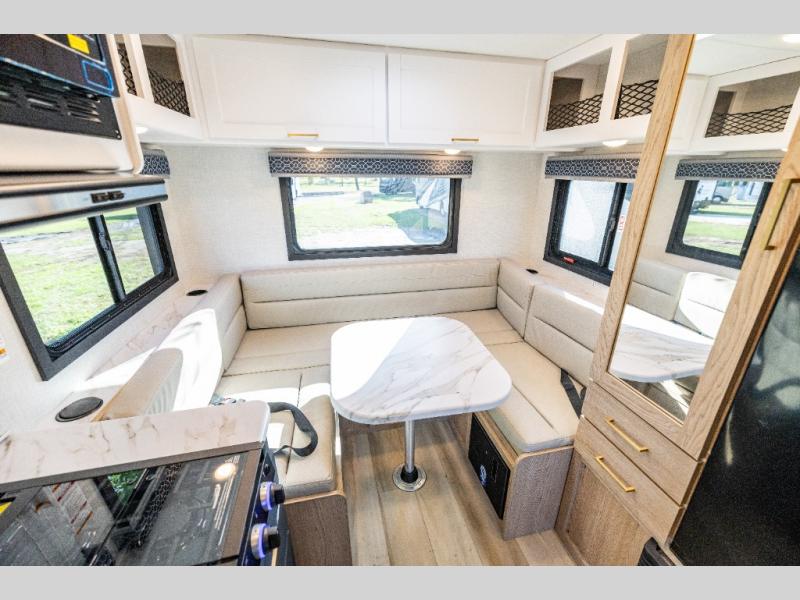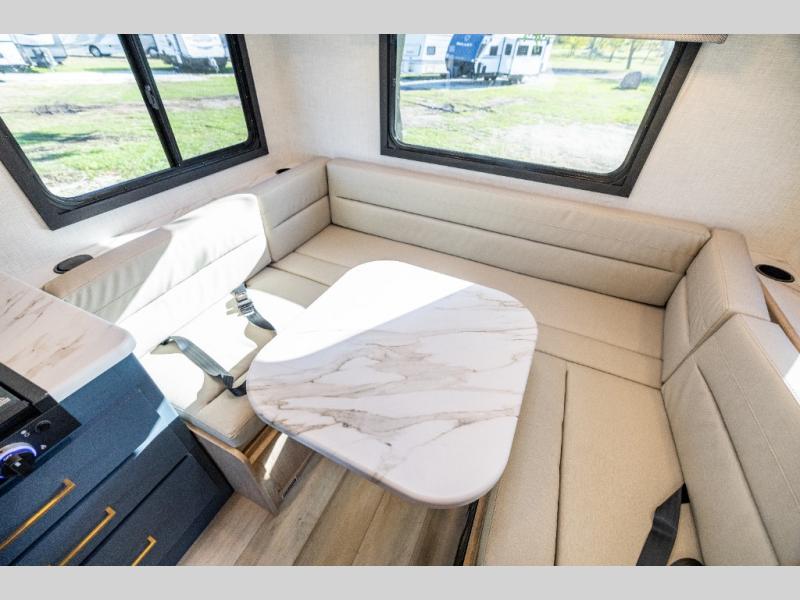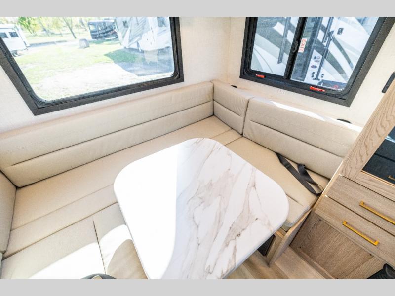 This compact, yet cozy coach is perfect for trips to the campground each weekend! Once you've reached your destination, you can set up the 11' power awning, unload the exterior storage compartments, and relax in your camp chairs. The two burner gas cooktop and convection microwave with an air fryer will let you make meals each day, and there is a 12V refrigerator to keep food fresh. A flip-up counter is another great feature that will give you more prep space! You can freshen up in the wet bath, grab your night clothes from the closet, then convert the U-shaped dinette into a 54" x 77" bed for a great night's rest!