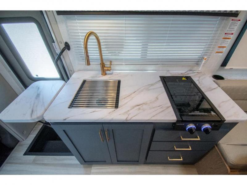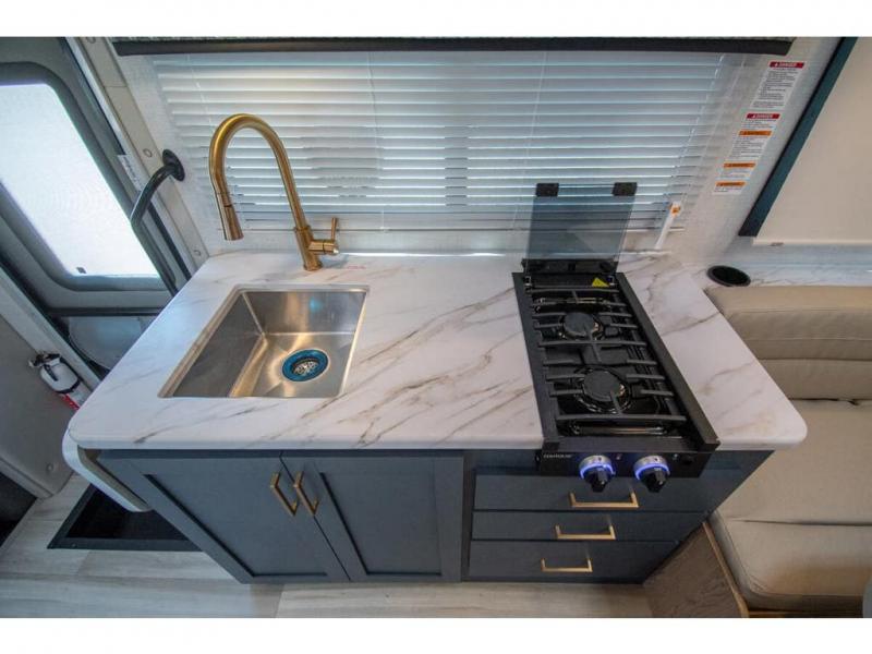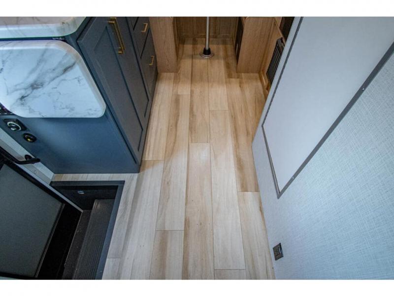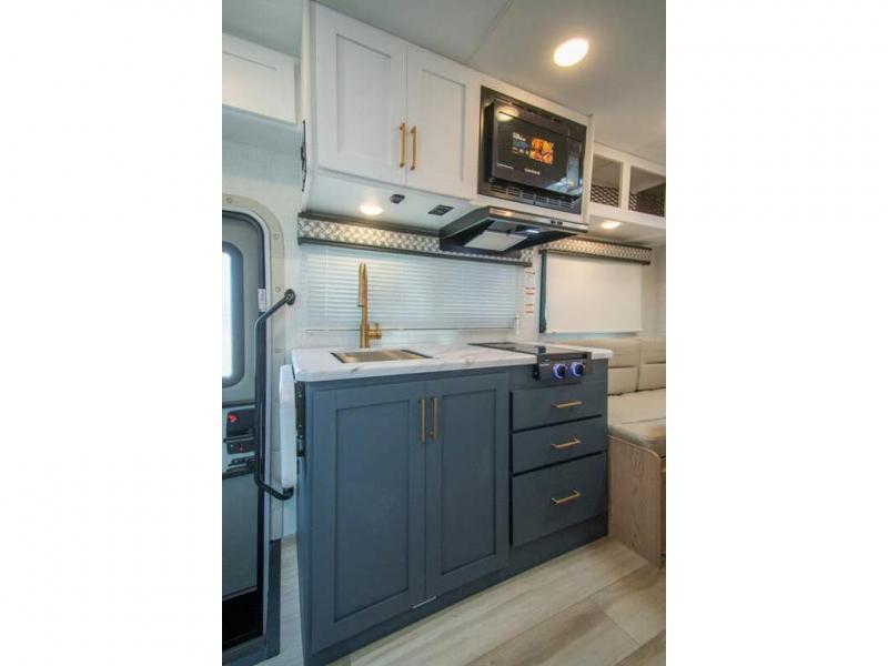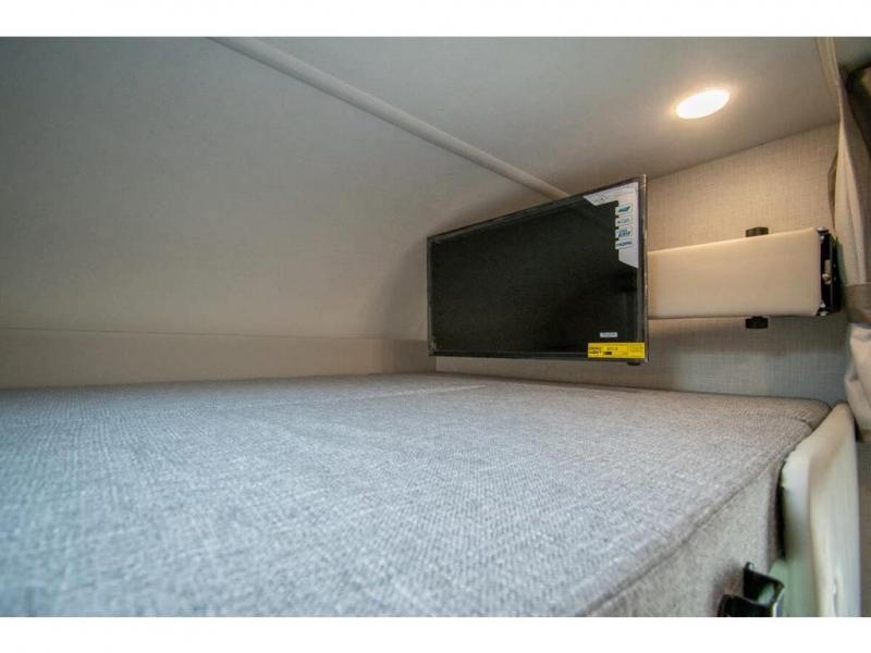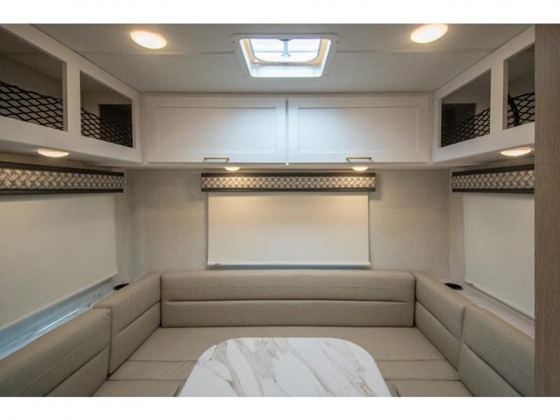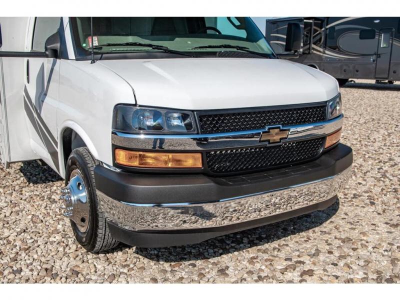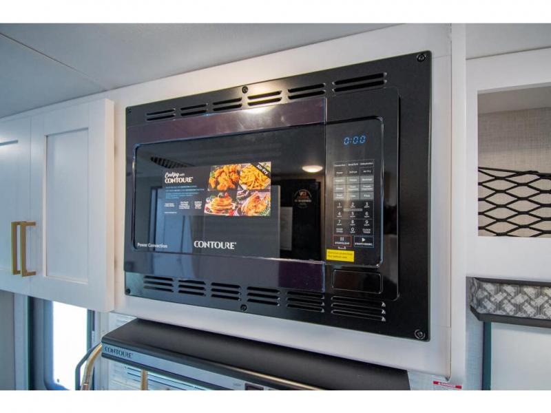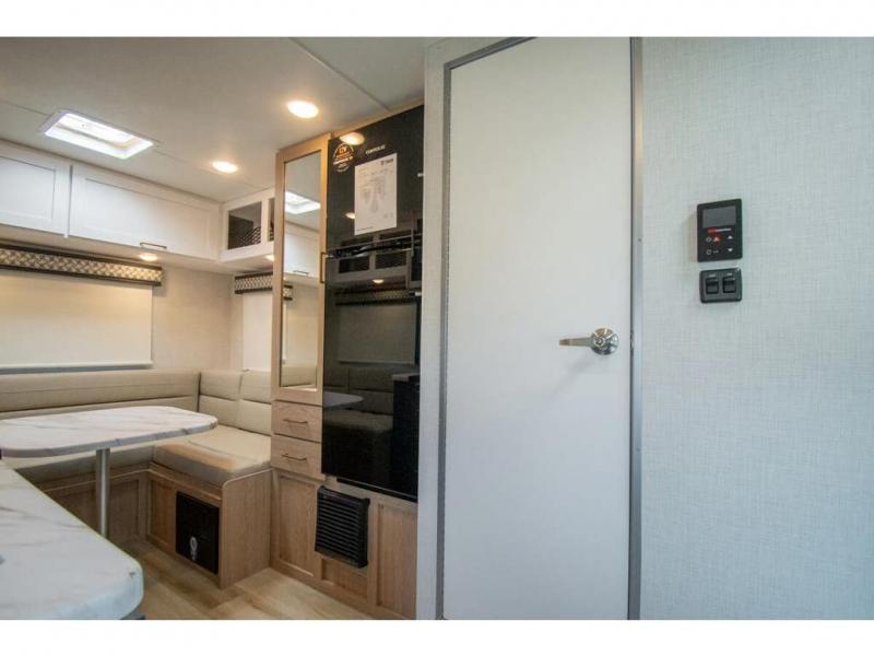 This compact, yet cozy coach is perfect for trips to the campground each weekend! Once you've reached your destination, you can set up the 11' power awning, unload the exterior storage compartments, and relax in your camp chairs. The two burner gas cooktop and convection microwave with an air fryer will let you make meals each day, and there is a 12V refrigerator to keep food fresh. A flip-up counter is another great feature that will give you more prep space! You can freshen up in the wet bath, grab your night clothes from the closet, then convert the U-shaped dinette into a 54" x 77" bed for a great night's rest!
