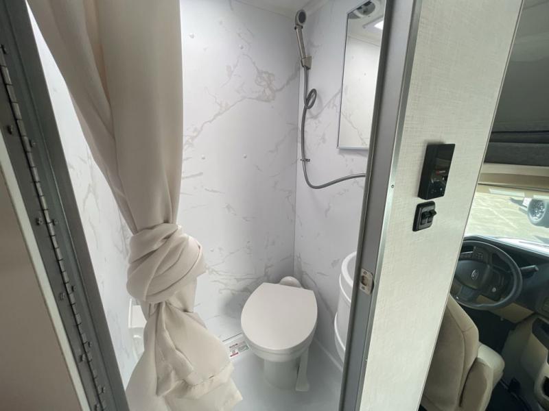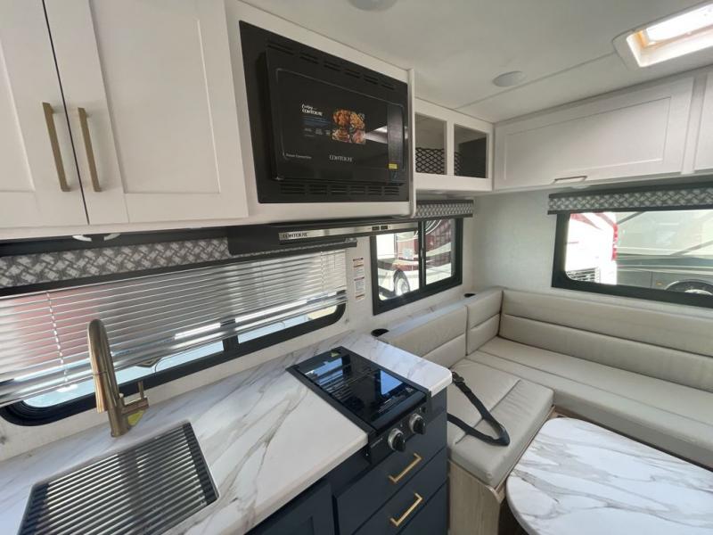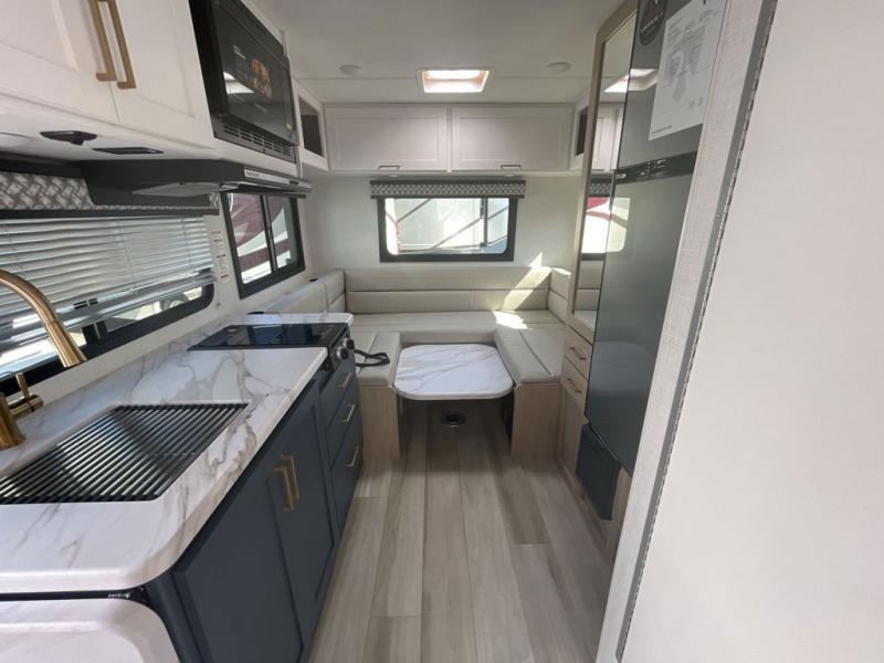 This compact, yet cozy coach is perfect for trips to the campground each weekend! Once you've reached your destination, you can set up the 11' power awning, unload the exterior storage compartments, and relax in your camp chairs. The two burner gas cooktop and convection microwave with an air fryer will let you make meals each day, and there is a 12V refrigerator to keep food fresh. A flip-up counter is another great feature that will give you more prep space! You can freshen up in the wet bath, grab your night clothes from the closet, then convert the U-shaped dinette into a 54" x 77" bed for a great night's rest!