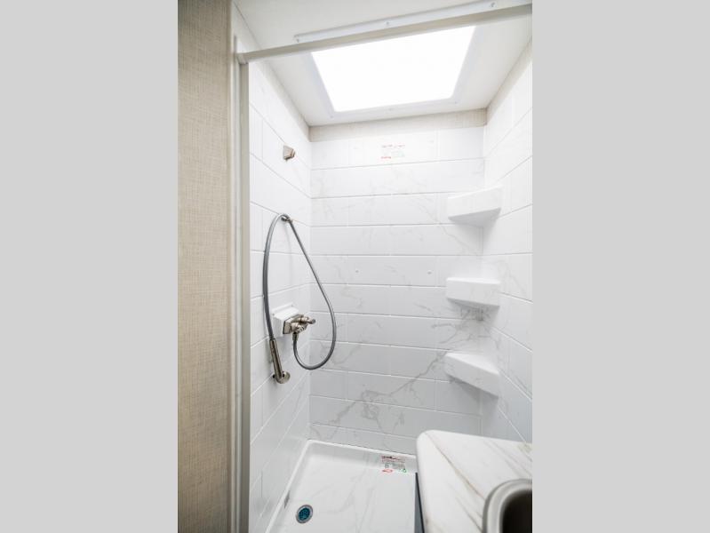 It won't be hard to find comfort in this coach for five! You can freshen up in the rear corner full bath once you've set up camp, then make lunch on the two burner gas cooktop or convection microwave with an air fryer. There is also a 12V refrigerator for cold items and a flip-up countertop for more space. Whether you dine at the Dream Dinette or take your plate outdoors under the 15' power awning, you're sure to have a great time in this motorhome. The rear corner full-size bed will provide a comfy place to rest your head at night, while your guests take the dinette and cab-over bunk!
