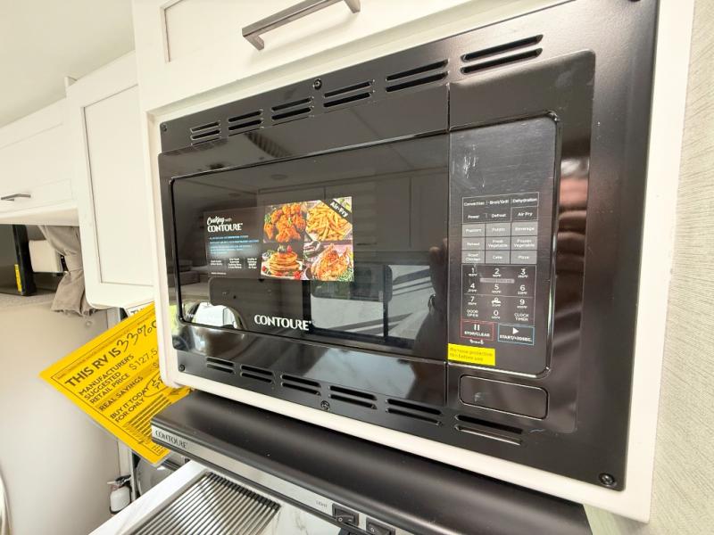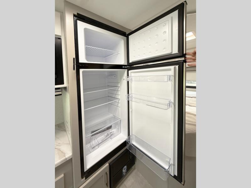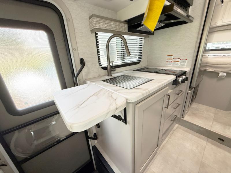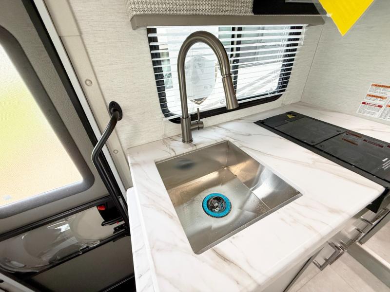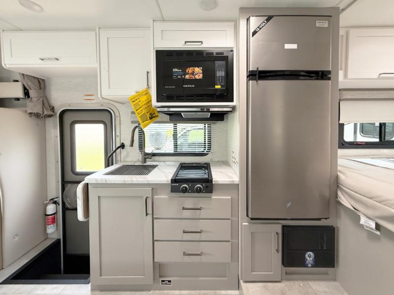 Inside, the LC21 boasts a thoughtfully designed floor plan that maximizes space and functionality. The leatherette Dream Dinette® provides a comfortable dining area and easily converts into additional sleeping space. The kitchen is equipped with a 12V refrigerator, a recessed 3-burner gas cooktop with oven, a microwave, and a large stainless steel sink with a pull-down sprayer, ensuring you have all the amenities needed for meal preparation on the road .