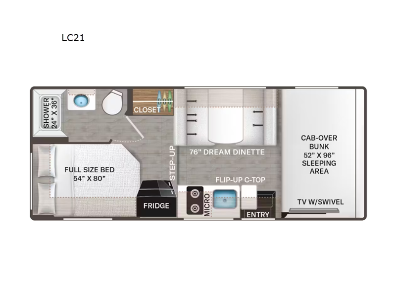 It won't be hard to find comfort in this coach for five! You can freshen up in the rear corner full bath once you've set up camp, then make lunch on the two burner gas cooktop or convection microwave with an air fryer. There is also a 12V refrigerator for cold items and a flip-up countertop for more space. Whether you dine at the Dream Dinette or take your plate outdoors under the 15' power awning, you're sure to have a great time in this motorhome. The rear corner full-size bed will provide a comfy place to rest your head at night, while your guests take the dinette and cab-over bunk!