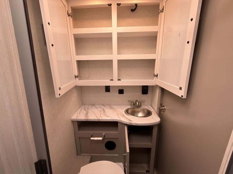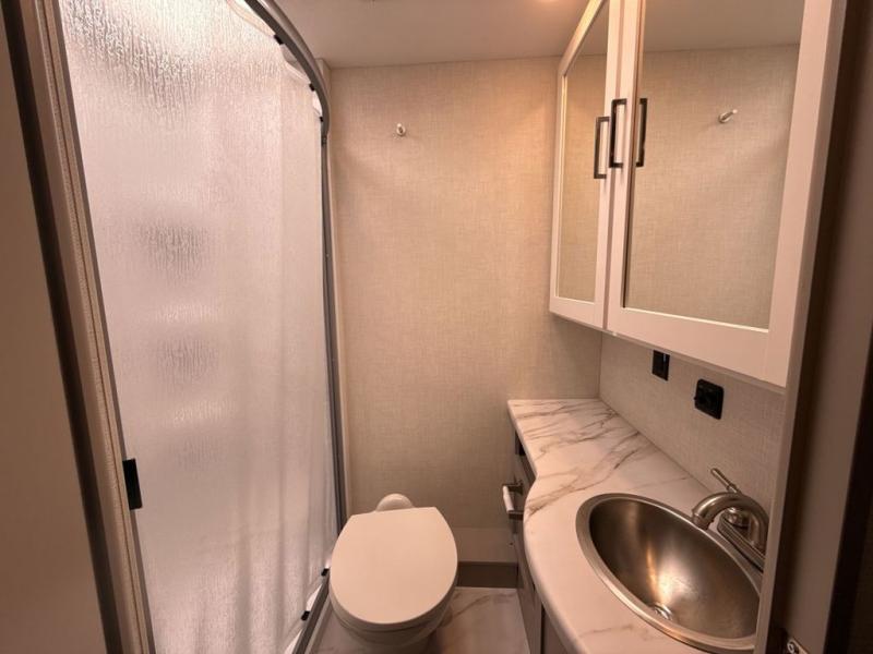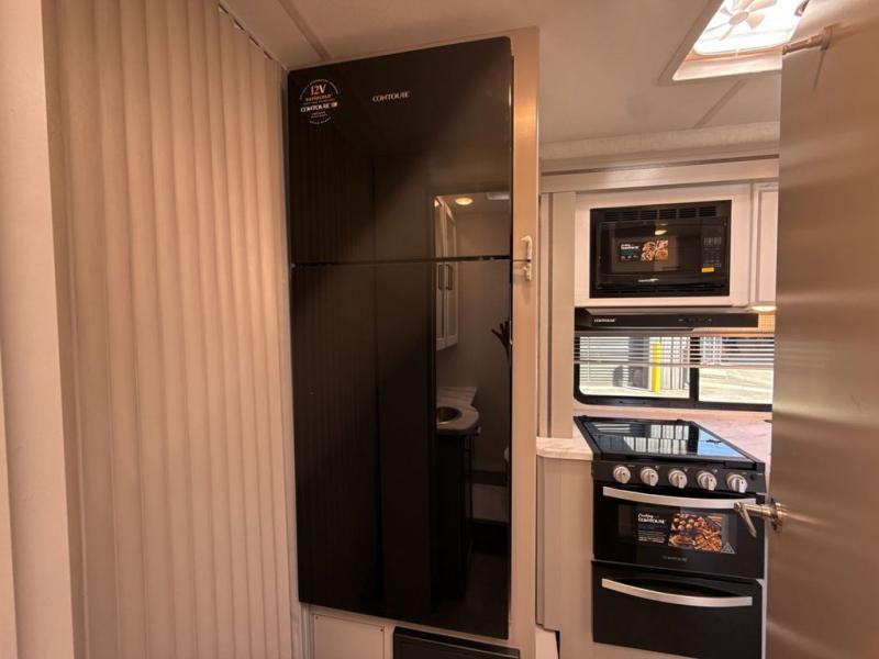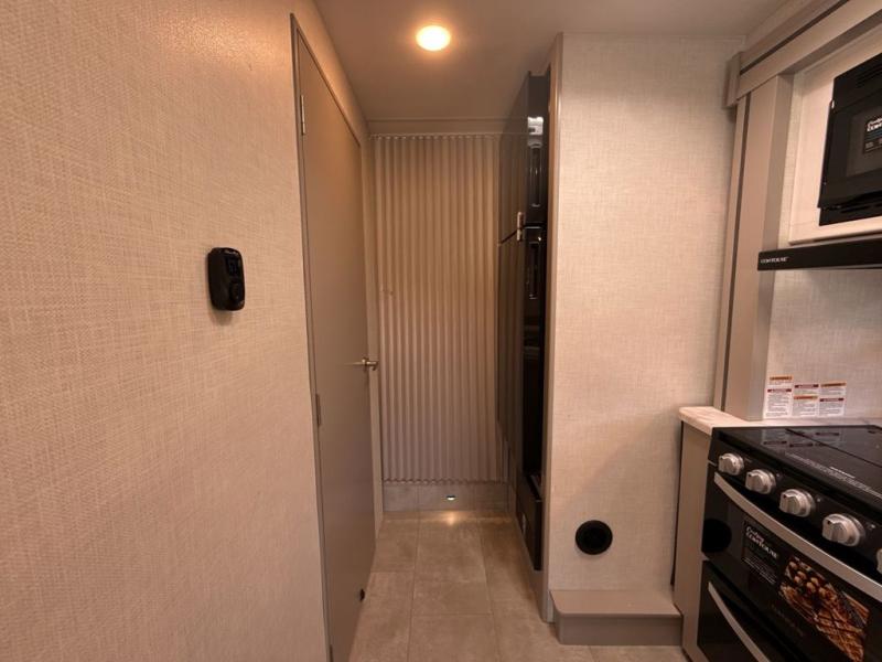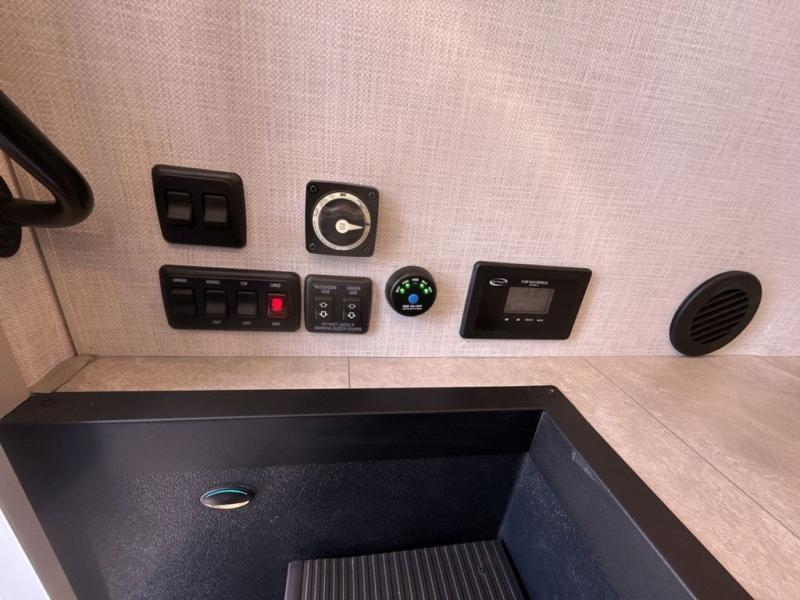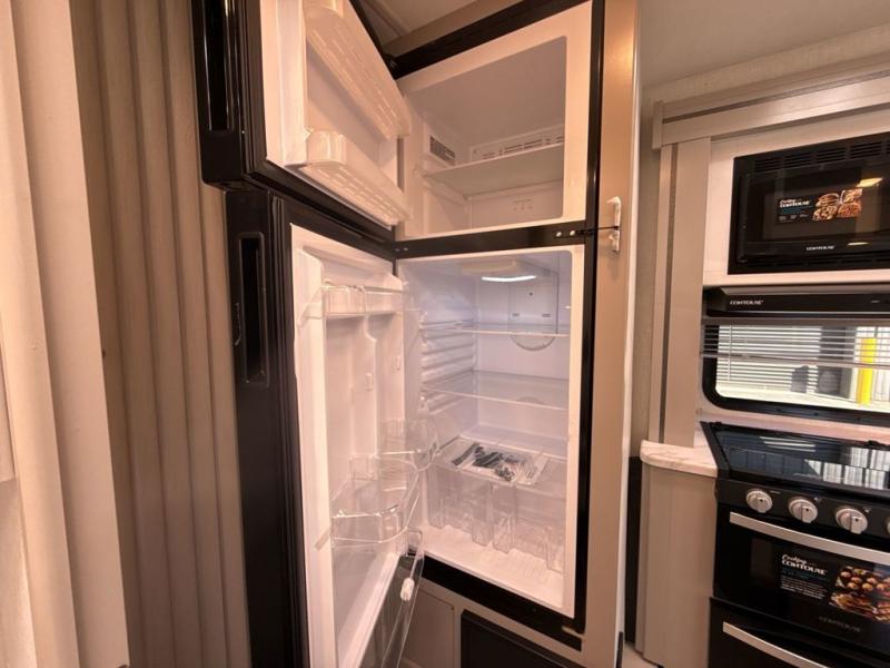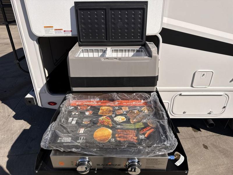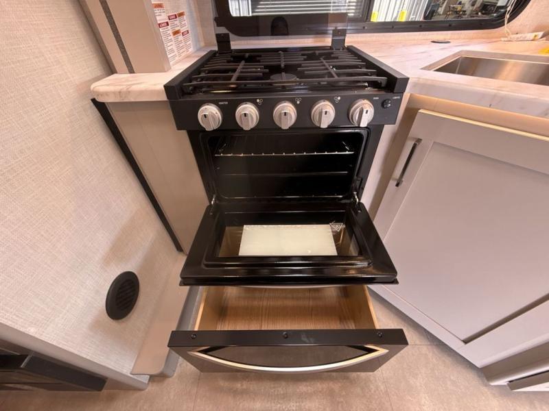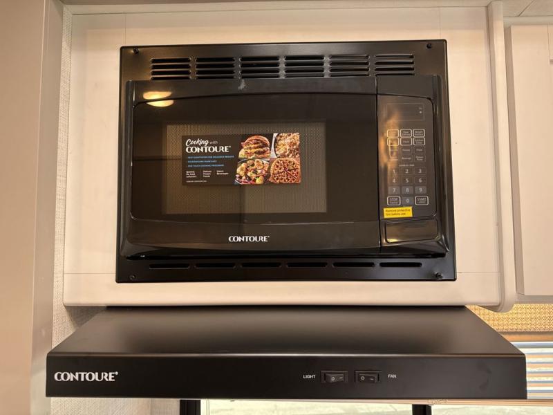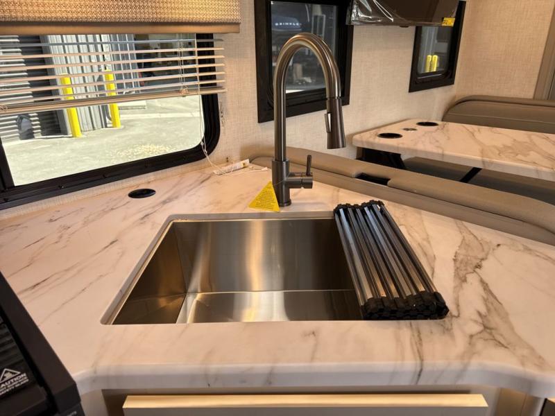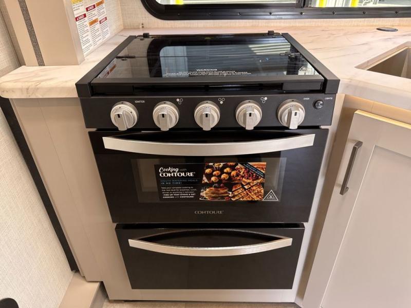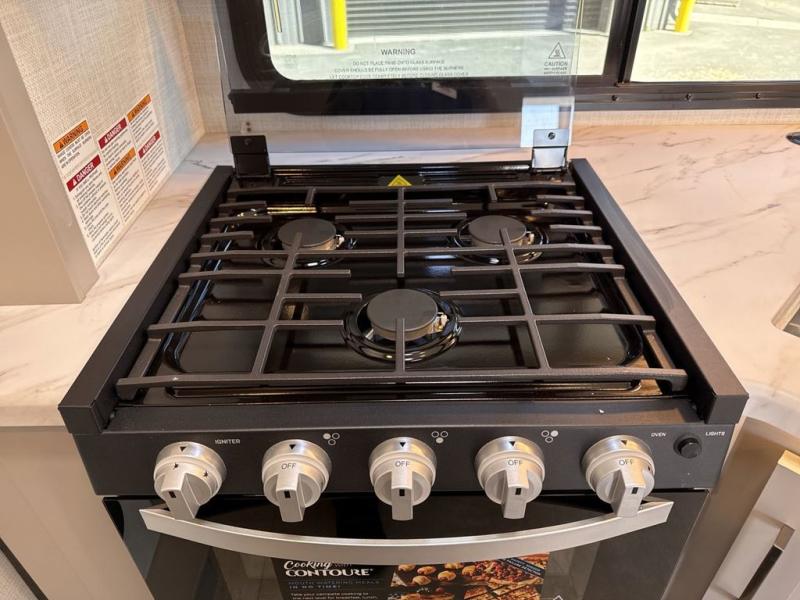 This coach features a rear private bedroom with a queen bed for that at-home feeling. You will enjoy having closets on either side of the bed for your clothes plus TV prep if you want to watch movies in bed. The full bath includes a power bath vent, a shower skylight, plus a foot flush toilet for convenience. The chef of your group can whip up a hearty meal on the three burner cooktop, or you can choose the optional exterior kitchen if they like to cook outdoors. There is even an optional exterior TV to make this space even more inviting! The main living area will be a favorite play to visit with its large slide out, leatherette Dream Dinette, and 40" Smart TV.