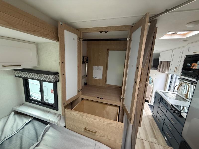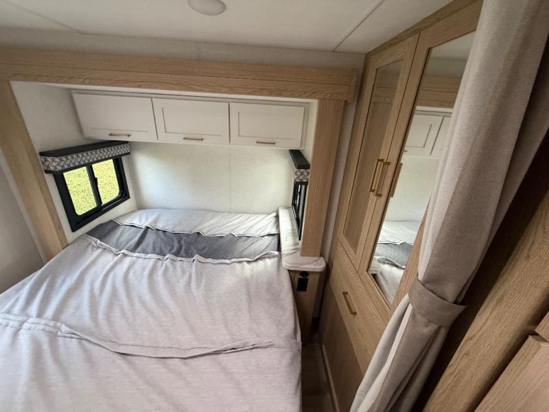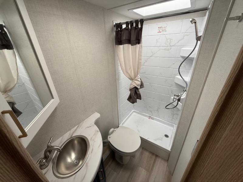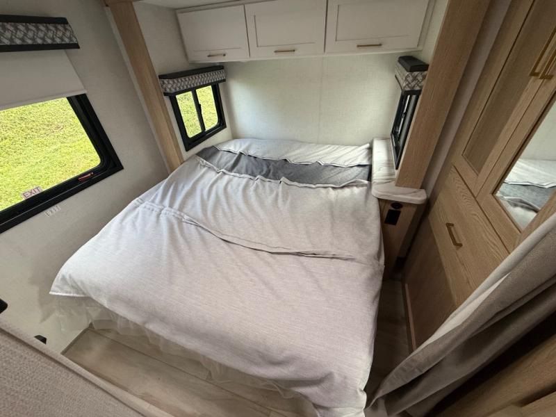 It won't be hard to find comfort in this coach for five! You can freshen up in the rear corner full bath once you've set up camp, then make lunch on the two burner gas cooktop or convection microwave with an air fryer. There is also a 12V refrigerator for cold items and a flip-up countertop for more space. Whether you dine at the Dream Dinette or take your plate outdoors under the 15' power awning, you're sure to have a great time in this motorhome. There is a semi-private bedroom with a 60" x 74" RV queen bed slide and bedroom TV prep if you want the option to watch movies in bed. And your guests can take the Dream Dinette and cab-over bunk at night!