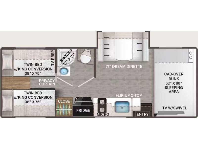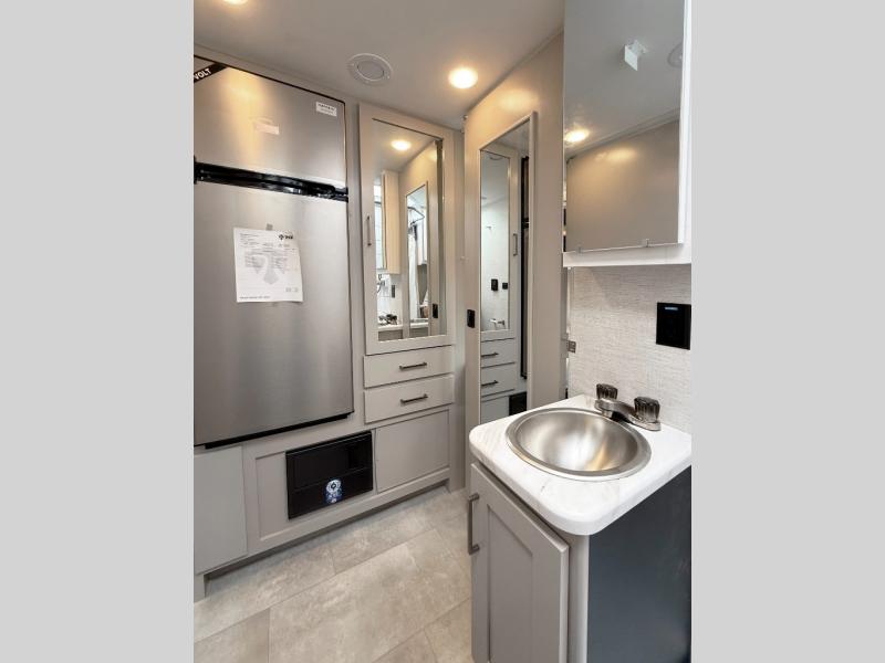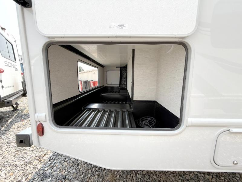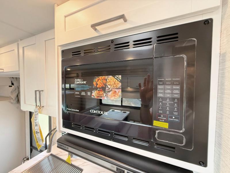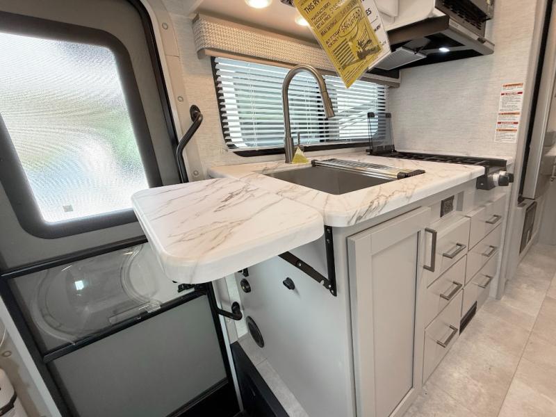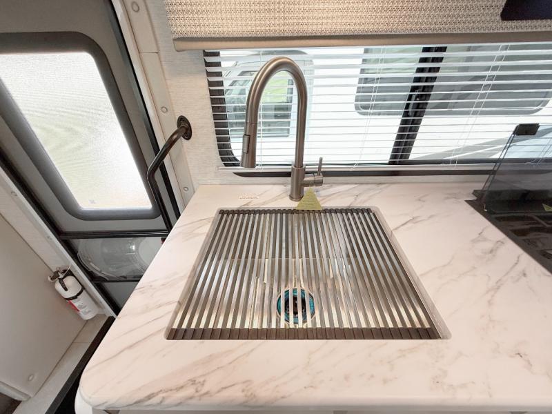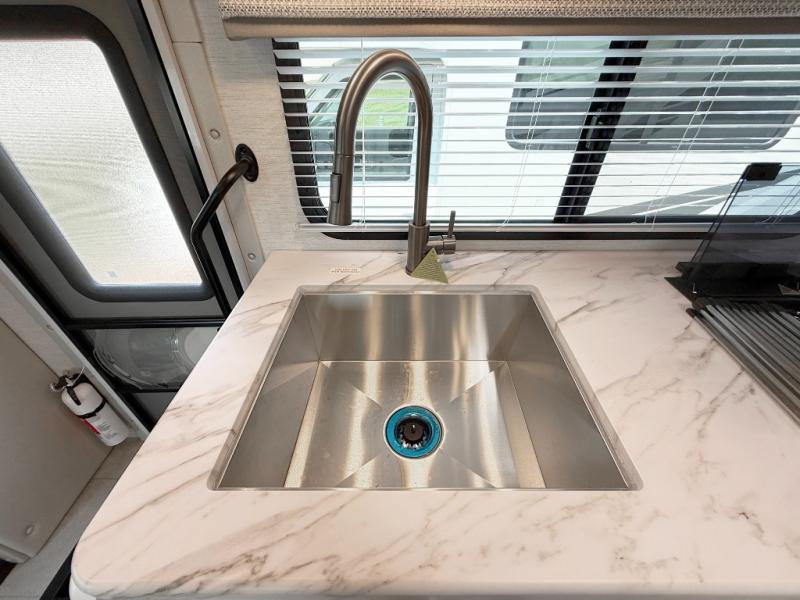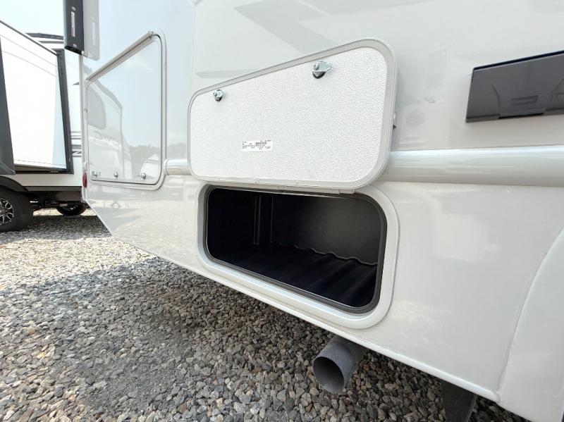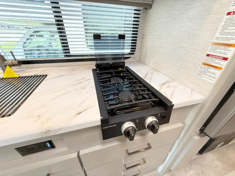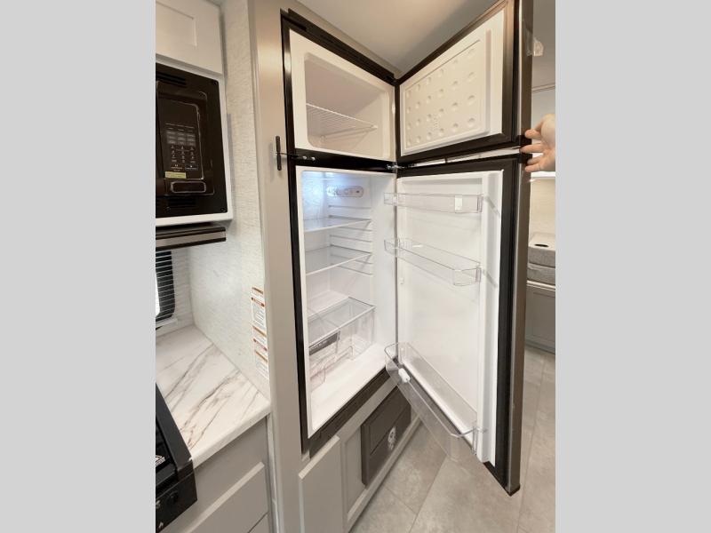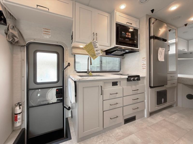 Inside, the LZ25 features a thoughtfully designed floor plan that maximizes space and functionality. The leatherette Dream Dinette® provides a comfortable dining area and easily converts into additional sleeping space. The kitchen is equipped with a 12V refrigerator, a recessed 3-burner gas cooktop with oven, a microwave, and a large stainless steel sink with a pull-down sprayer, ensuring you have all the amenities needed for meal preparation on the road.