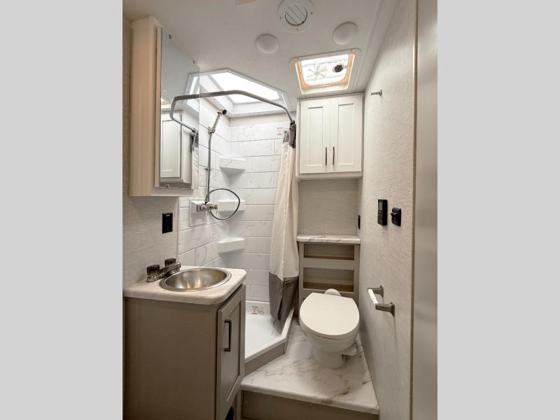 The rear corner bathroom features a foot-flush porcelain toilet, a stainless steel sink, and a shower with a skylight, offering a private and convenient space to freshen up. For entertainment, the LZ25 comes with a 39" Smart TV on a manual swivel mount, allowing you to enjoy your favorite shows and movies from the comfort of your bed or dinette.