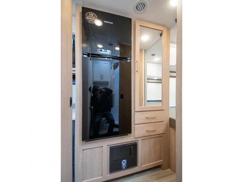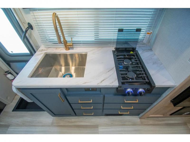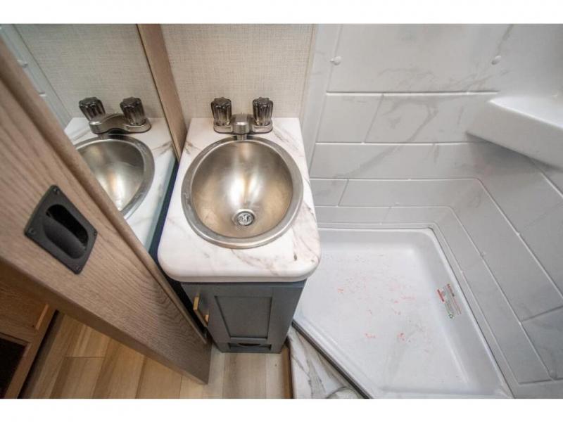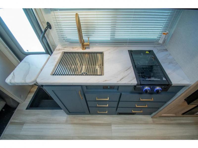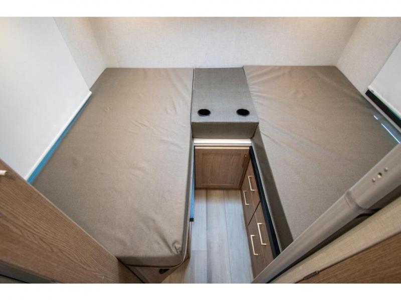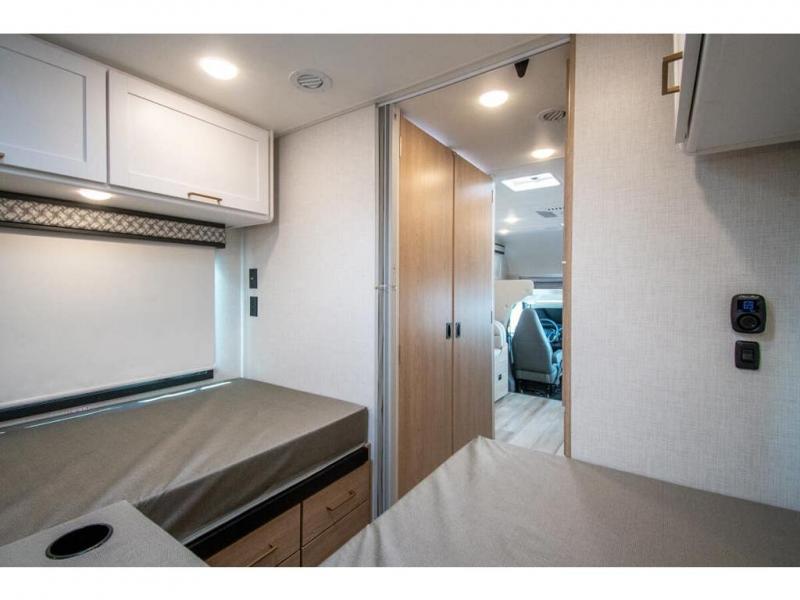 It won't be hard to find comfort in this coach for five! You can freshen up in the mid-coach full bath once you've set up camp, then make lunch on the two burner gas cooktop or convection microwave with an air fryer. There is also a 12V refrigerator for cold items and a flip-up countertop for more space. Whether you dine at the Dream Dinette slide out or take your plate outdoors under the 17' 6" power awning, you're sure to have a great time in this motorhome. The semi-private rear bedroom includes a privacy curtain, two twin beds with a king-size bed conversion, plus TV prep if you want the option to watch shows in bed. And any guests you may have can sleep on the dinette and 52" x 96" cab-over sleeping space!