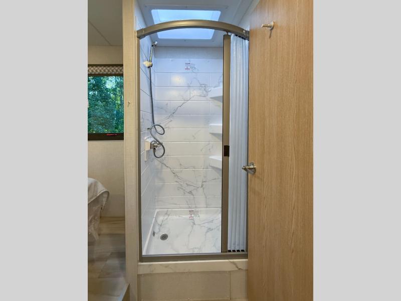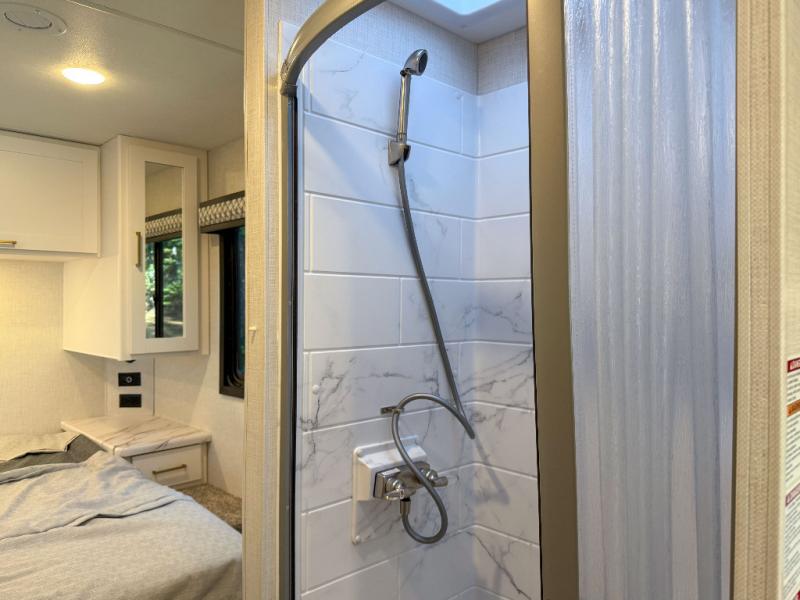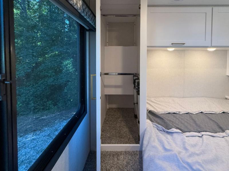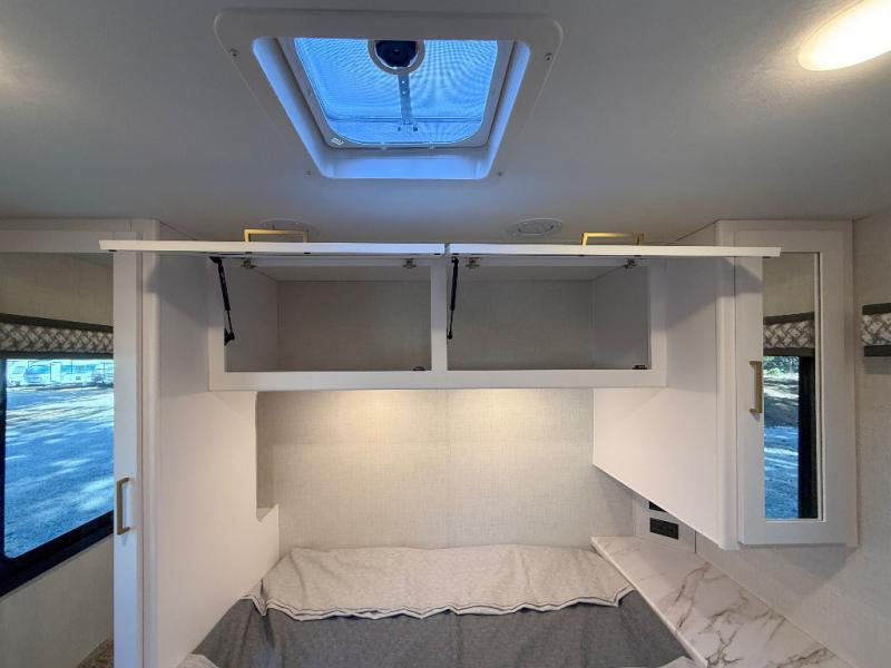 Head across the state or country in this spacious coach for five to six! The cab-over bunk area features a 52" x 96" sleeping area, plus a built-in skylight and a 32" Smart TV on swivel to enjoy movie nights. Your crew can relax on the 68" sofa and dream dinette while the chef of your group is making lunch on the two burner gas cooktop with a glass cover. The full bath features a 24" x 36" shower, with the toilet and sink across the hall, and the door can shut off the toilet if two people are needing to use this space at once. Head to the rear private bedroom where you'll find an RV queen bed, dual bedside closets to keep your things organized, and TV prep if you choose to add entertainment here.