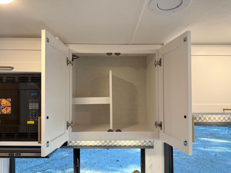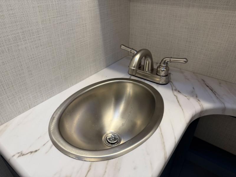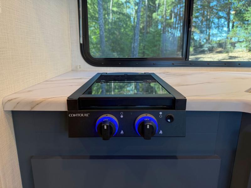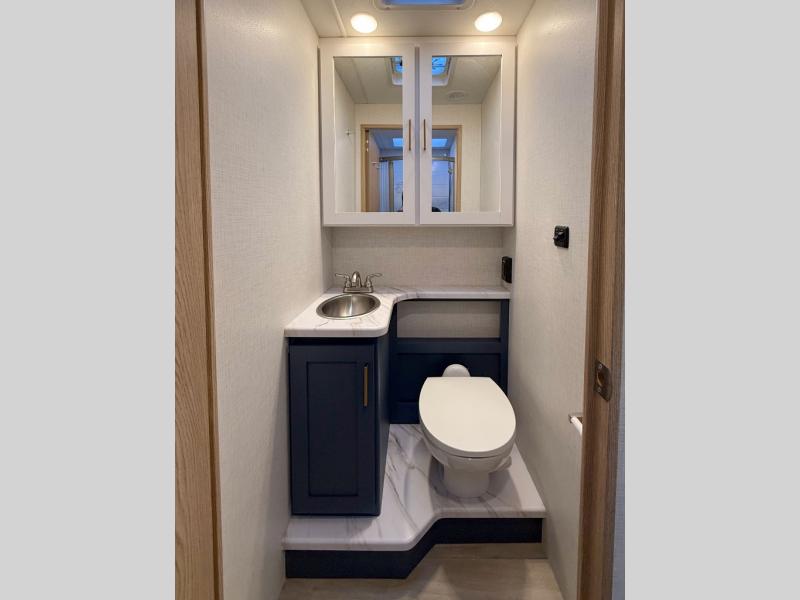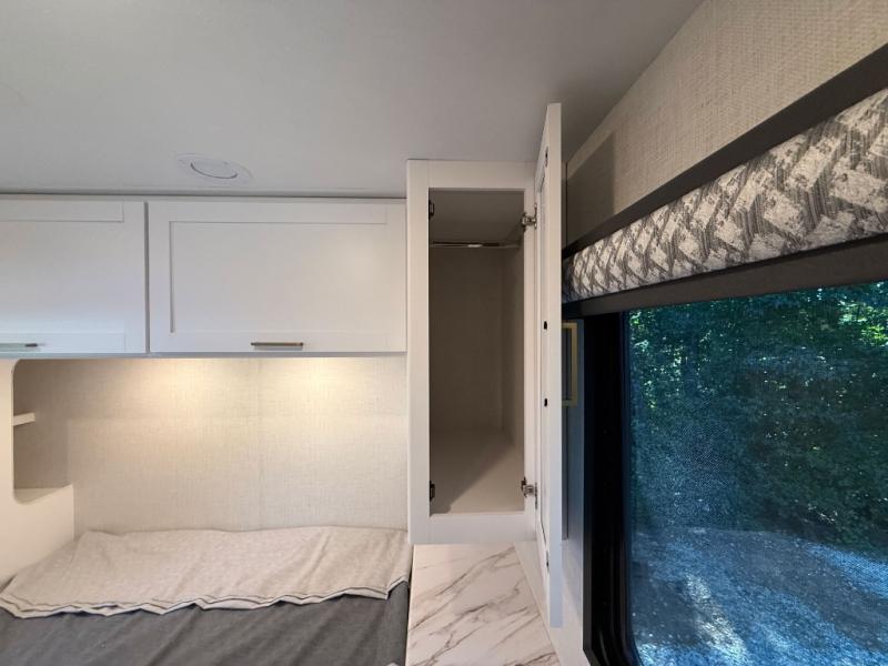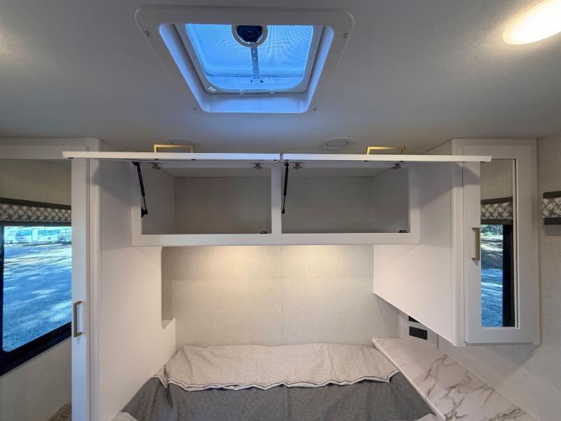 Head across the state or country in this spacious coach for five to six! The cab-over bunk area features a 52" x 96" sleeping area, plus a built-in skylight and a 32" Smart TV on swivel to enjoy movie nights. Your crew can relax on the 68" sofa and dream dinette while the chef of your group is making lunch on the two burner gas cooktop with a glass cover. The full bath features a 24" x 36" shower, with the toilet and sink across the hall, and the door can shut off the toilet if two people are needing to use this space at once. Head to the rear private bedroom where you'll find an RV queen bed, dual bedside closets to keep your things organized, and TV prep if you choose to add entertainment here.