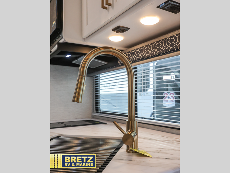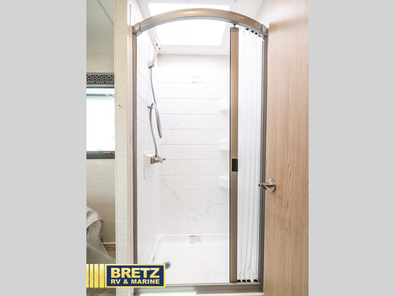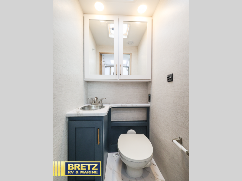 Head across the state or country in this spacious coach for five to six! The cab-over bunk area features a 52" x 96" sleeping area, plus a built-in skylight and a 32" Smart TV on swivel to enjoy movie nights. Your crew can relax on the 68" sofa and dream dinette while the chef of your group is making lunch on the two burner gas cooktop with a glass cover. The full bath features a 24" x 36" shower, with the toilet and sink across the hall, and the door can shut off the toilet if two people are needing to use this space at once. Head to the rear private bedroom where you'll find an RV queen bed, dual bedside closets to keep your things organized, and TV prep if you choose to add entertainment here.