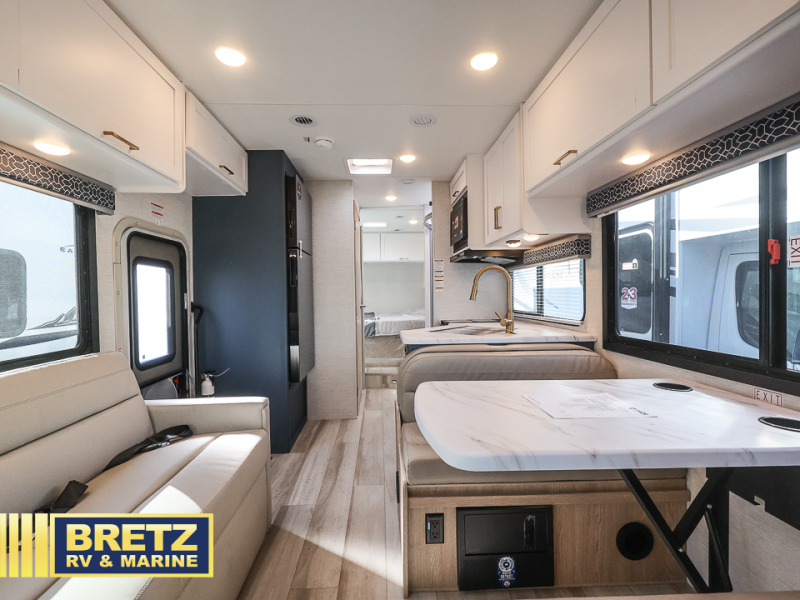 With any Quantum ESpec Essential Class C gas motorhome by Thor Motor Coach, you will find convenient amenities, a modern interior, and a reliable chassis to power your adventures. There is welded tubular aluminum roof and sidewall cage construction, a one-piece fiberglass front cap, and premium one-piece Crossflex exterior roofing for added strength. Residential vinyl flooring will be easy to keep clean, and you'll love the sleek look of the Harbor Collection, three-toned cabinets. These motorhomes also include a 50 state 4.0 kW dual gas/LP generator and a 30-amp shoreline power cord to keep you going, along with a tankless water heater and 13,500 roof front A/C to ensure your comfort!