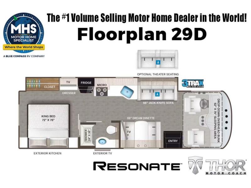 MSRP $201,878. New 2026 Thor Motor Coach Resonate 29D. This RV measures approximately 30 feet 9 inches in length and features a Ford F-53 chassis with a 7.3L V-8 engine with 335HP, a six speed automatic transmission, a drop-down overhead loft, slide-out and a bedroom TV. The Resonate also boasts an impressive list of standard features including the Winegard Connect 2.0 WiFi, rotary battery disconnect switch, adjustable shelving bracketry, BM Pro Multiplex system, power privacy shade on windshield, touchscreen radio that features navigation and back-up monitor, heated remote exterior mirrors with integrated sideview cameras, lateral power patio awning with integrated LED lighting and much more. Shop hundreds of class A motorhomes all at 1 location! Choose from Thor A.C.E. – Resonate – Hurricane – Windsport – Luminate – Indigo – Vegas – Axis – Challenger – Miramar Fleetwood Flair – Fortis – Flex – Bounder - Forest River Georgetown - FR3 – Entegra Coach Vision – Vision XL – Emblem – Holiday Rambler Admiral – Eclipse – Invicta – Vacationer - and much more. We also sell quality pre-owned models such as Jayco Alante SE – Alante – Precept – Precept Prestige – Tiffin Allegro Open Road – Newmar Canyon Star – Bay Star – Winnebago Vista – Sunstar – Adventurer – Coachmen Mirada – Pursuit - Encore and much more. Visit MHSRV.com for our complete line-up and the sale prices that have made us the #1 volume selling motor home dealership in the world 12 years in a row! For additional details on this unit and our entire inventory including brochures, window sticker, videos, photos, reviews & testimonials as well as additional information about Motor Home Specialist and our manufacturers please visit us at MHSRV.com or call 800-335-6054. At Motor Home Specialist, we DO NOT charge any prep or orientation fees like you will find at other dealerships. All sale prices include a 200-point inspection, interior & exterior wash, detail service and a fully automated high-pressure rain booth test and coach wash that is a standout service unlike that of any other in the industry. You will also receive a thorough coach orientation with an MHSRV technician, a night stay in our delivery park featuring landscaped and covered pads with full hook-ups and much more! Read Thousands upon Thousands of 5-Star Reviews at MHSRV.com and See What They Had to Say About Their Experience at Motor Home Specialist. WHY PAY MORE? WHY SETTLE FOR LESS?