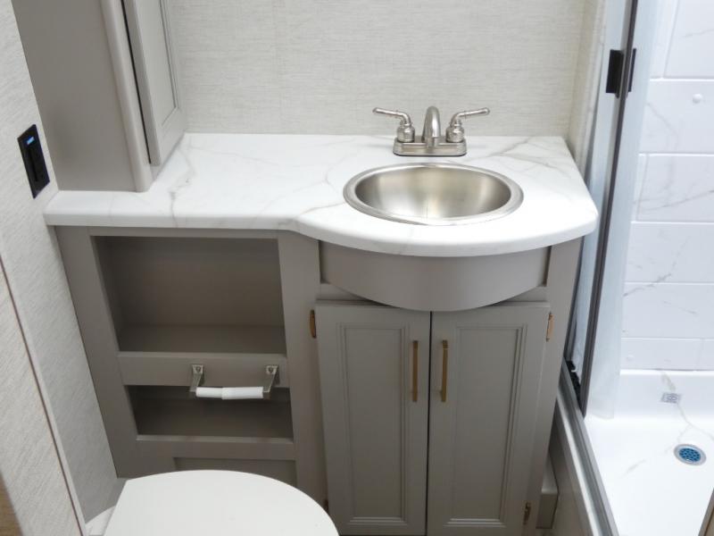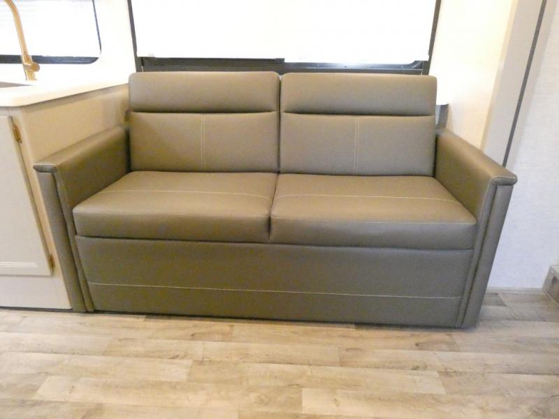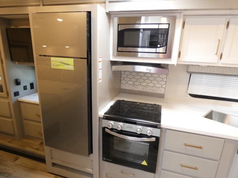 Wherever you decide to roam, you will be met with at-home comforts in this Resonate coach! Once you arrive at your destination, the swivel captain's chairs can become a part of the living area, and your guests can relax on the jack-knife sofa or Dream Dinette. The little ones are sure to love the drop-down overhead bunk, and there is a 40" LED Smart TV in the living area to enjoy a movie together. Within the spacious kitchen you'll find a 12V DC double door refrigerator, a microwave oven, plus a large single bowl stainless steel sink for easy clean-up, and the mid-coach full bath is easily accessible for everyone. The rear private bedroom will feel just like home with its king bed and 32" LED Smart TV, plus there is a dresser and a closet to keep your clothes wrinkle-free. This model also includes an outdoor kitchen with a refrigerator, a sink, and a 1,000-watt inverter!