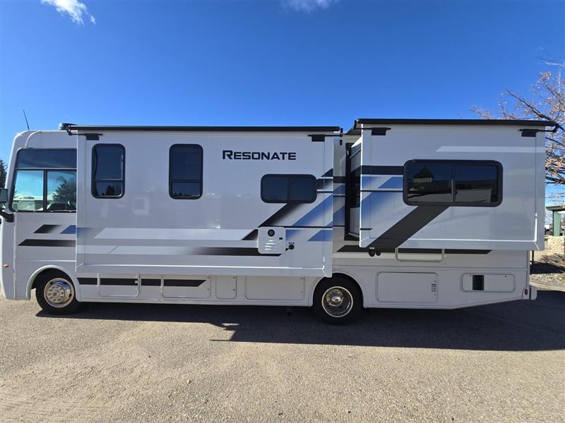 With any Resonate Class A gas motorhome by Thor Motor Coach you will find solid construction materials, including a one-piece fiberglass front cap, a welded tubular steel floor, and block foam insulation to enjoy camping all year long. The Ford F-53 chassis is ultra durable for many trips across the country, and the automatic leveling jacks with touchpad controls make setting up camp easier than ever. You will also love the rotocast storage compartments for all your gear, plus an HD-MAX exterior and framed windows for a more sleek look. The interior of each Resonate coach is warm and inviting with its residential vinyl flooring, flat panel cabinetry, and 7' interior ceiling height, and there are solid surface countertops the chef of your group is sure to love. An Onan RV QG 4000 gas generator also comes standard, along with dual 13,500 BTU roof A/C's, and a Winegard ConnecT WiFi extender + 4G to keep you connected to the outside world as you travel.