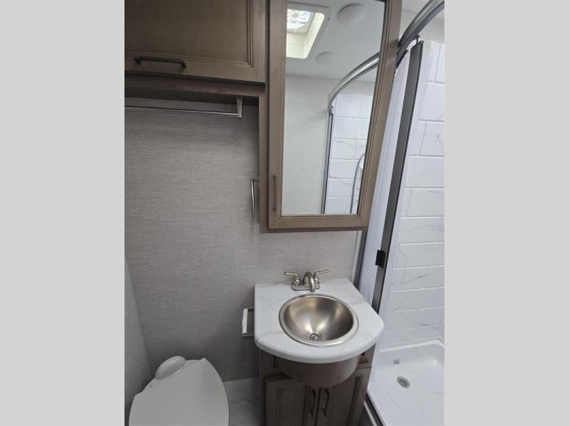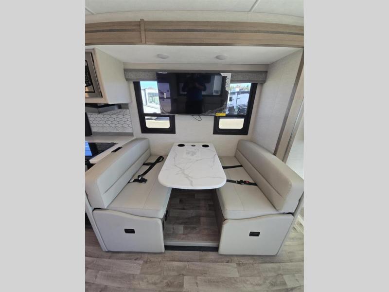 This coach includes everything you need and nothing you don't! From the semi-private bedroom and full bath, to the swivel captain's seats and drop-down overhead bunk, you won't be left wanting. The chef of your crew will love the extra counter space in the kitchen, along with a three burner cooktop and a microwave oven to prepare meals. You'll find dining space at the Dream Dinette, or you can sit at the camp picnic table under the 19' power awning with LED lights. This coach includes plenty of storage space, including a basement pass-through, a large bedroom closet, plus a kitchen pantry. And if you plan to go full-time, the closet with a combo washer and dryer prep will allow you to skip the laundromat!