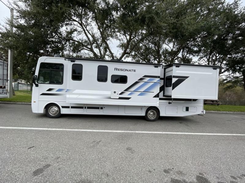 With any Resonate Class A gas motorhome by Thor Motor Coach you will find solid construction materials, including a one-piece fiberglass front cap, a welded tubular steel floor, and block foam insulation to enjoy camping all year long. The Ford F-53 chassis is ultra durable for many trips across the country, and the automatic leveling jacks with touchpad controls make setting up camp easier than ever. You will also love the rotocast storage compartments for all your gear, plus an HD-MAX exterior and framed windows for a more sleek look. The interior of each Resonate coach is warm and inviting with its residential vinyl flooring, flat panel cabinetry, and 7' interior ceiling height, and there are solid surface countertops the chef of your group is sure to love. An Onan RV QG 4000 gas generator also comes standard, along with dual 13,500 BTU roof A/C's, and a Winegard ConnecT WiFi extender + 4G to keep you connected to the outside world as you travel.
