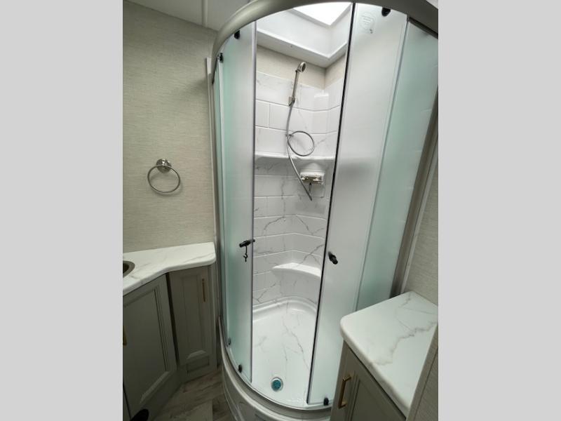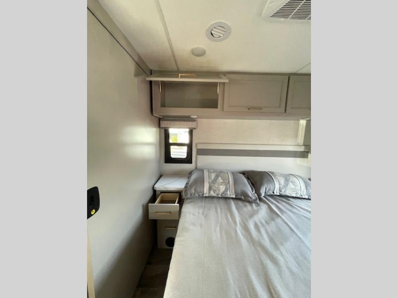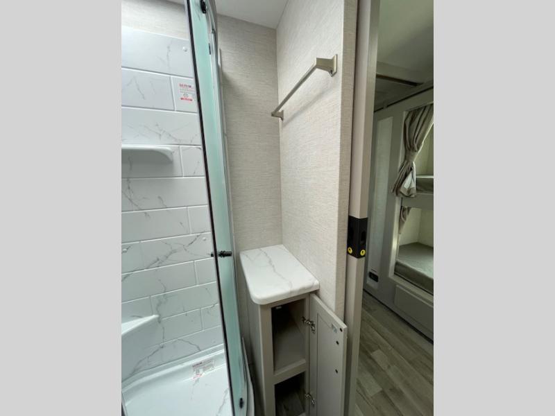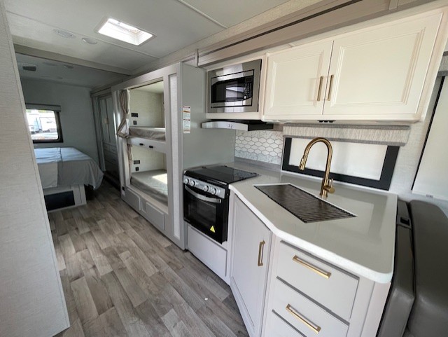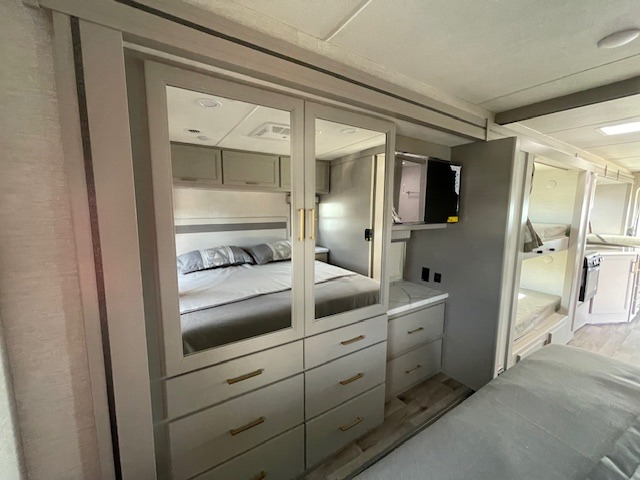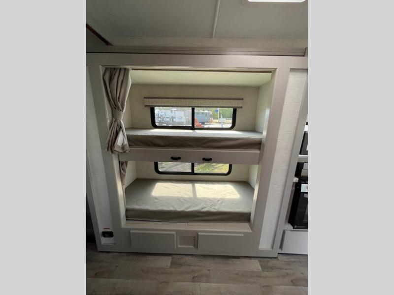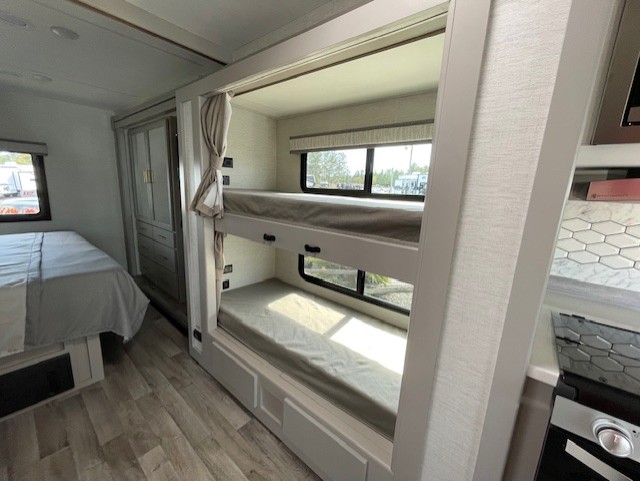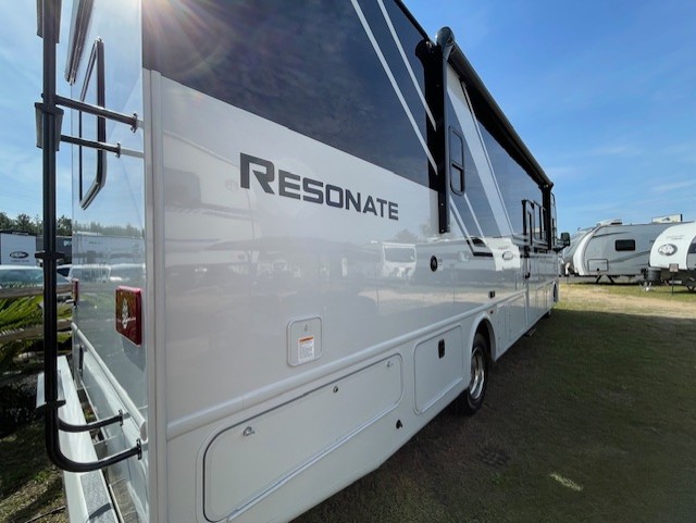 If you're looking for a coach with a larger sleeping capacity and added interior space, you've found it in this Resonate 32B! Once the full-wall slide is extended you can dine at the Dream Dinette or relax on the jack-knife sofa that sits directly across from the 40" LED Smart TV. The little ones will love the drop-down overhead bunk and bunk beds, plus the full bath is right across the bunks for easy nighttime use. You will have the rear private bedroom all to yourselves with a king bed and your own 32" LED Smart TV, and any other guests can sleep on the living area furniture. In the morning you can whip up a hearty breakfast on the three burner cooktop, or use the microwave oven for instant oatmeal if you're on the go. You can spend your day hiking or swimming, or you may just want to visit under the 19' power awning with LED lights and watch the game on the exterior 32" TV!