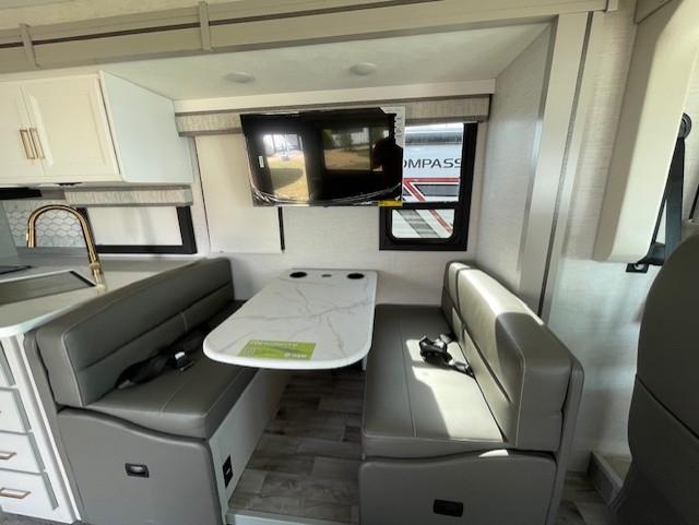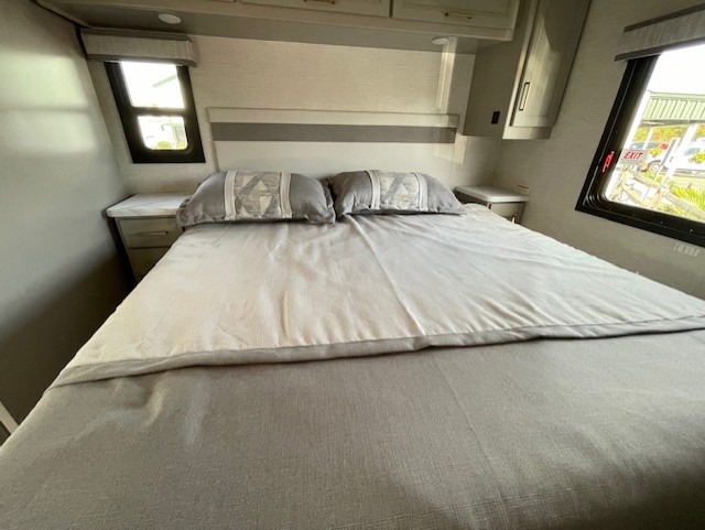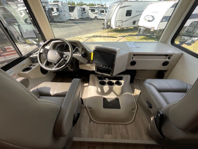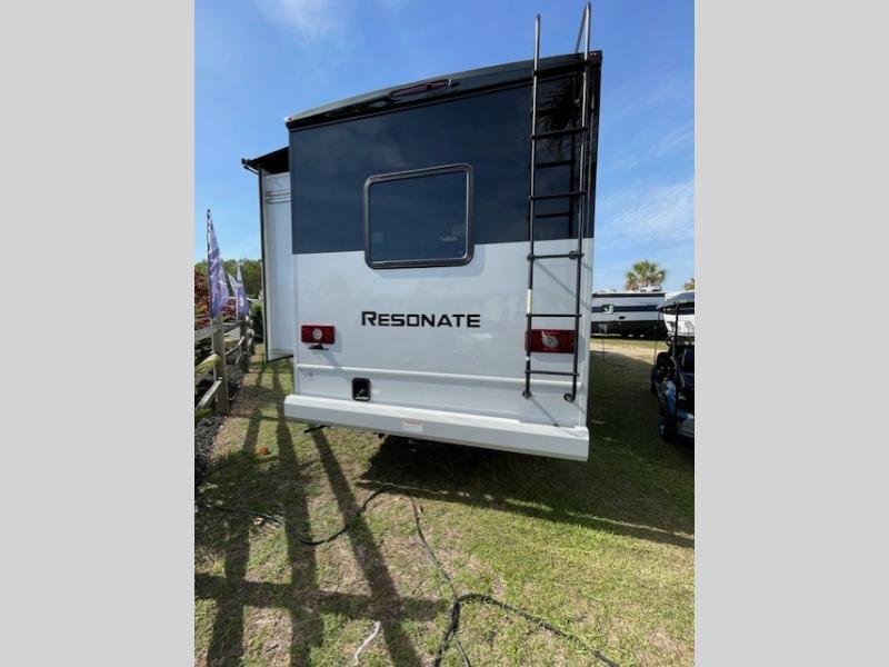 With any Resonate Class A gas motorhome by Thor Motor Coach you will find solid construction materials, including a one-piece fiberglass front cap, a welded tubular steel floor, and block foam insulation to enjoy camping all year long. The Ford F-53 chassis is ultra durable for many trips across the country, and the automatic leveling jacks with touchpad controls make setting up camp easier than ever. You will also love the rotocast storage compartments for all your gear, plus an HD-MAX exterior and framed windows for a more sleek look. The interior of each Resonate coach is warm and inviting with its residential vinyl flooring, flat panel cabinetry, and 7' interior ceiling height, and there are solid surface countertops the chef of your group is sure to love. An Onan RV QG 4000 gas generator also comes standard, along with dual 13,500 BTU roof A/C's, and a Winegard ConnecT WiFi extender + 4G to keep you connected to the outside world as you travel.