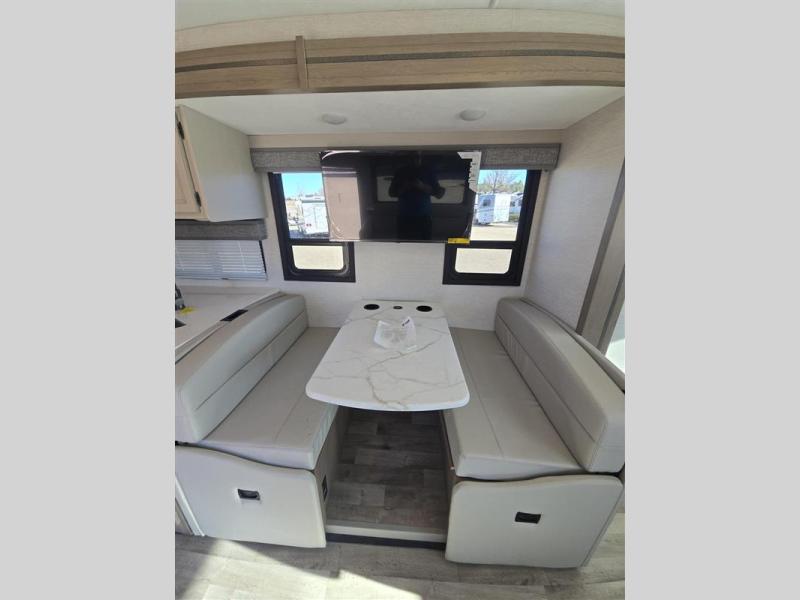 With any Resonate Class A gas motorhome by Thor Motor Coach you will find solid construction materials, including a one-piece fiberglass front cap, a welded tubular steel floor, and block foam insulation to enjoy camping all year long. The Ford F-53 chassis is ultra durable for many trips across the country, and the automatic leveling jacks with touchpad controls make setting up camp easier than ever. You will also love the rotocast storage compartments for all your gear, plus an HD-MAX exterior and framed windows for a more sleek look. The interior of each Resonate coach is warm and inviting with its residential vinyl flooring, flat panel cabinetry, and 7' interior ceiling height, and there are solid surface countertops the chef of your group is sure to love. An Onan RV QG 4000 gas generator also comes standard, along with dual 13,500 BTU roof A/C's, and a Winegard ConnecT WiFi extender + 4G to keep you connected to the outside world as you travel.