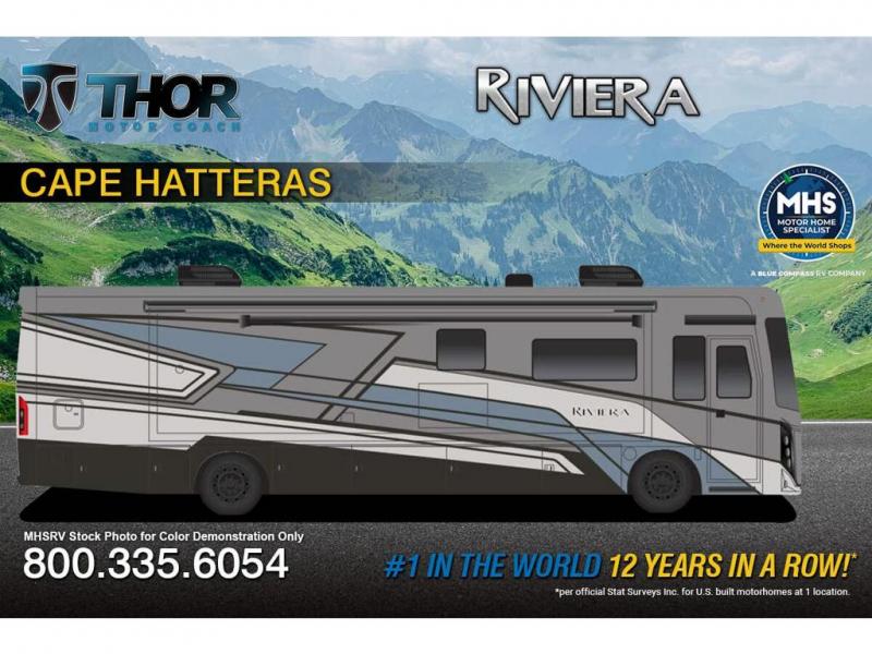 With any Riviera Class A diesel motorhome by Thor Motor Coach, you will enjoy a luxury home on wheels wherever you decide to roam! You will appreciate a capable Freightliner CS-S straight rail chassis with an Atlas foundation and better fuel mileage with the Cummins ISB-XT 6.7L diesel engine. There is a spacious basement pass-through storage for your camp gear, a powered patio awning with LED lighting, and an exterior 40" LED TV for outdoor movie nights. You will be able to enjoy your coach for years to come thanks to the durable construction materials that include a welded tubular steel floor, Vacu-Bond laminated roof, walls, and floor, plus a one-piece domed roof membrane. The elegant interior is designed with luxury vinyl tile flooring, "Wyndham" cabinetry with “Rake” style cabinet doors & nickel finish hardware. Some of the amenities you'll appreciate on each model include the RapidCamp+ multiplex wiring control system, a tankless water heater, and an Onan RV QD 6000 diesel generator. Enjoy your RV life with a Riviera Class A diesel coach!
