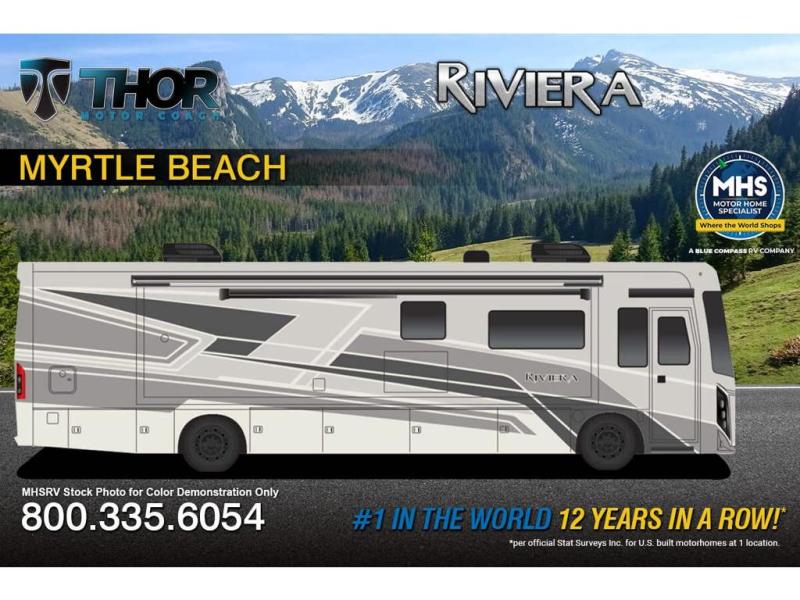 With any Riviera Class A diesel motorhome by Thor Motor Coach, you will enjoy a luxury home on wheels wherever you decide to roam! You will appreciate a capable Freightliner CS-S straight rail chassis with an Atlas foundation and better fuel mileage with the Cummins ISB-XT 6.7L diesel engine. There is a spacious basement pass-through storage for your camp gear, a powered patio awning with LED lighting, and an exterior 40" LED TV for outdoor movie nights. You will be able to enjoy your coach for years to come thanks to the durable construction materials that include a welded tubular steel floor, Vacu-Bond laminated roof, walls, and floor, plus a one-piece domed roof membrane. The elegant interior is designed with luxury vinyl tile flooring, "Wyndham" cabinetry with “Rake” style cabinet doors & nickel finish hardware. Some of the amenities you'll appreciate on each model include the RapidCamp+ multiplex wiring control system, a tankless water heater, and an Onan RV QD 6000 diesel generator. Enjoy your RV life with a Riviera Class A diesel coach!