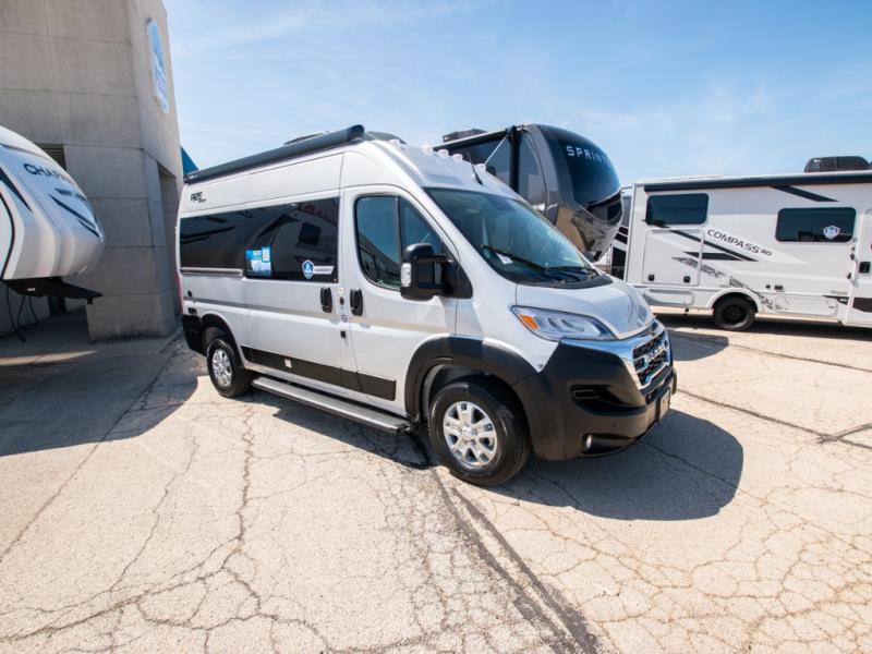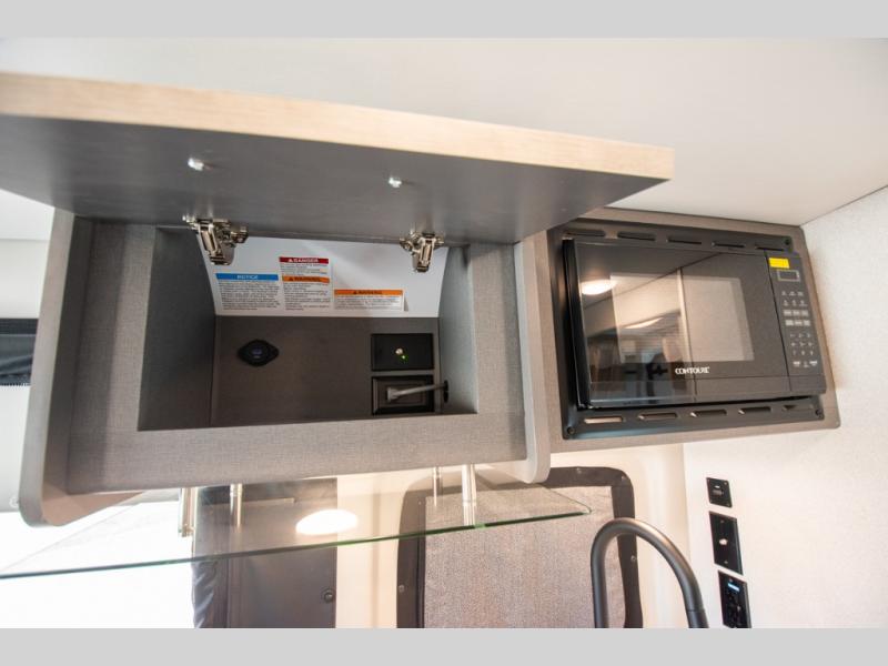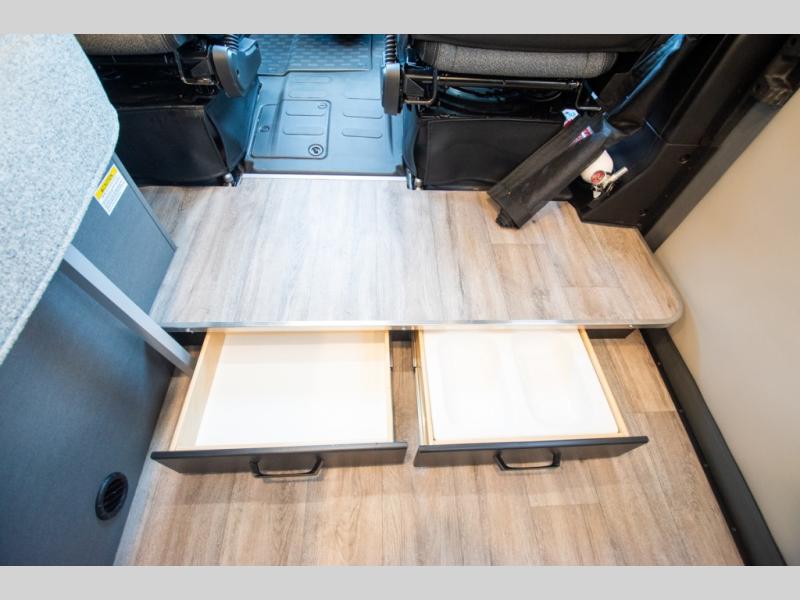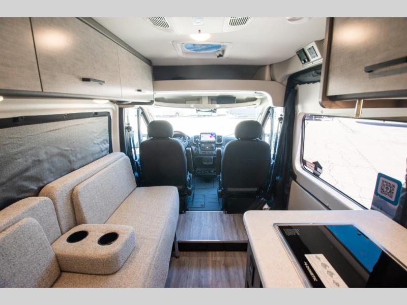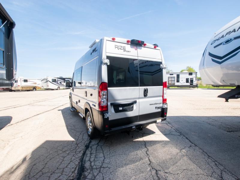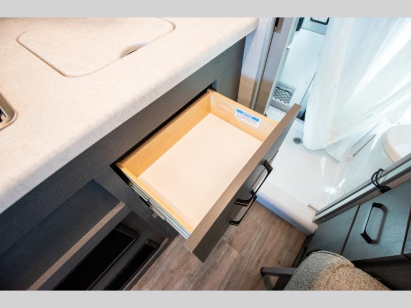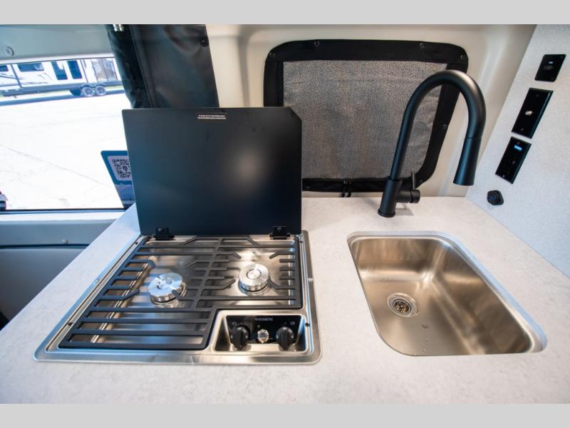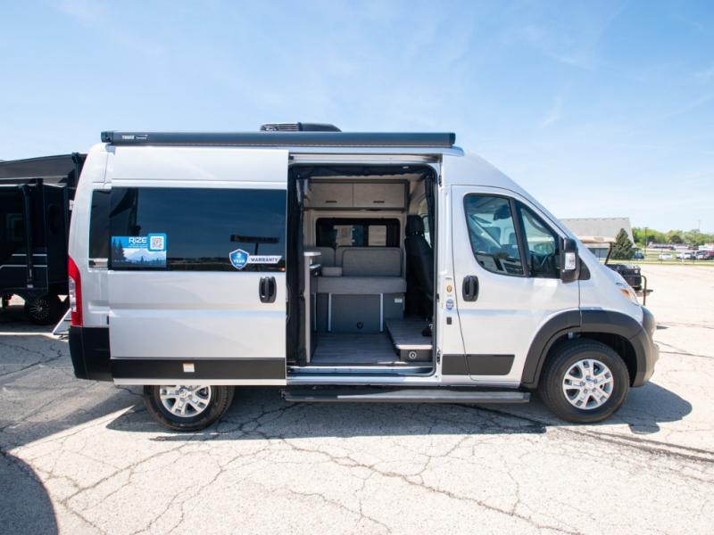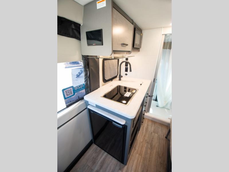 The Rize Sport Class B gas motorhome by Thor Motor Coach allows you to experience the camping lifestyle in a compact RV packed with convenient features. There is a 3.6L Pentastar V6 engine and 276 HP to power your excursions, and the outdoor enthusiast will love the exterior sprayer. Each model includes residential vinyl flooring, Welformed interior wall panels, and slap style cabinet doors, and cassette shades. You'll find pressed countertops in the kitchen and a glass protective cover and task lighting above the cooktop to easily cook meals each day. The keyless entry system adds to the convenience found throughout these models, plus there is an exterior LP connection if you want to hook up your own grill!