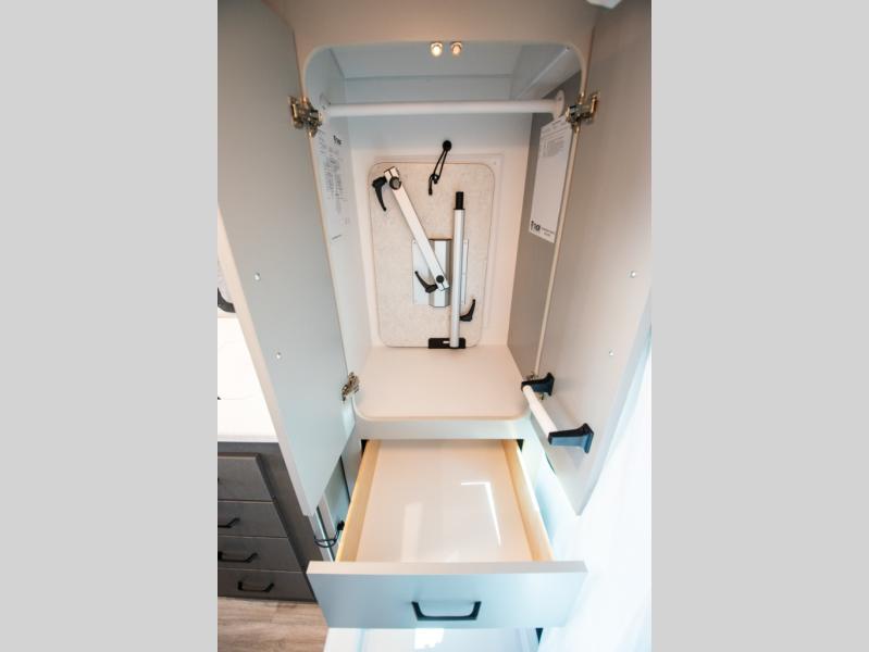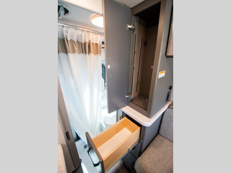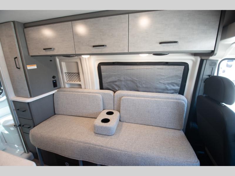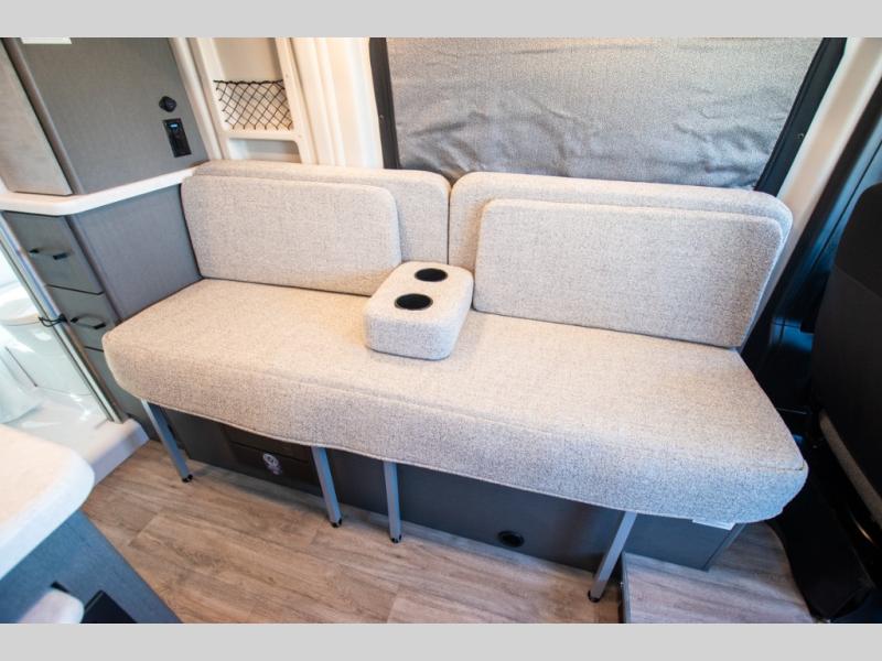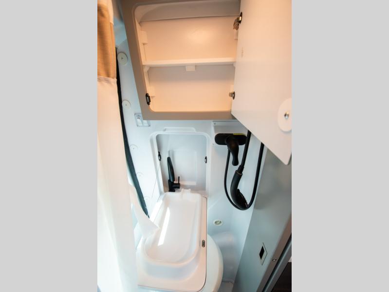 This coach is the perfect home on wheels for all your adventures. You will have everything you need, including a wet bath with a cassette toilet and pocket doors to save space. Once you have prepared breakfast on the two-burner gas cooktop, you can dine on the sofa with a removable table. This area can then be your sleeping space at night since the sofa converts into a 72" x 47" pull-out bed. Whether you're enjoying the fresh air let in by the large opening side windows, or you're sipping on a cold drink outside, you will love everything about this coach!