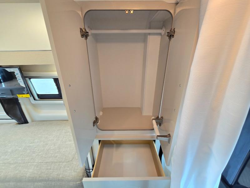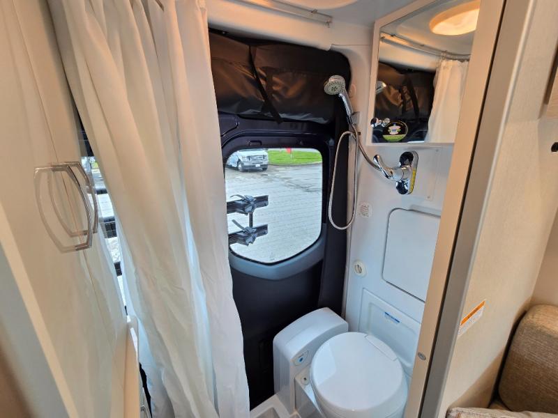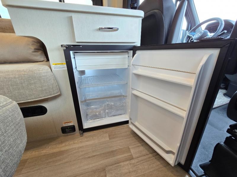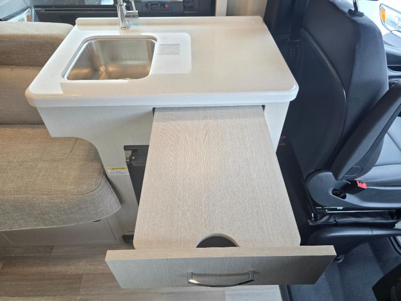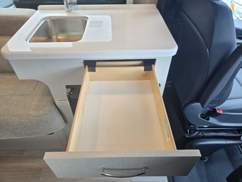 The perfect traveling companion for two who enjoy life on the road. The captain's chairs up front swivel to provide more seating in back, plus you have a 70" x 70" expandable sleeper sofa with a removable table nearby. The single burner induction cooktop allows you to make meals easily when stopped, and there is also a sink for cleaning up and refrigerator as well. You will find a flip-down TV in the living area located in front that can be viewed from anywhere in back! A wet bath in the very back allows all travelers to stay clean and fresh during the trip, and there is a wardrobe plus drawers to keep your clothing and personal items neat and tidy while you travel.