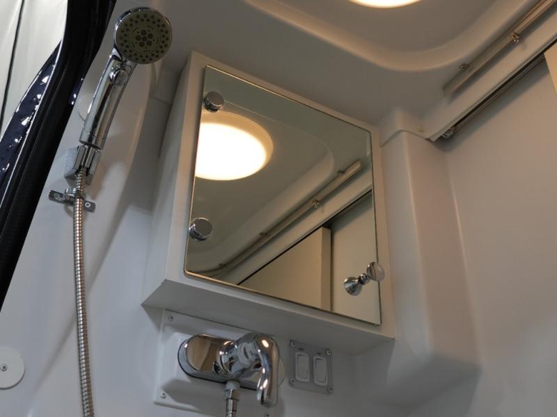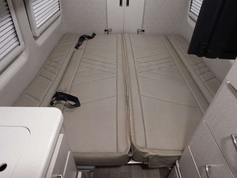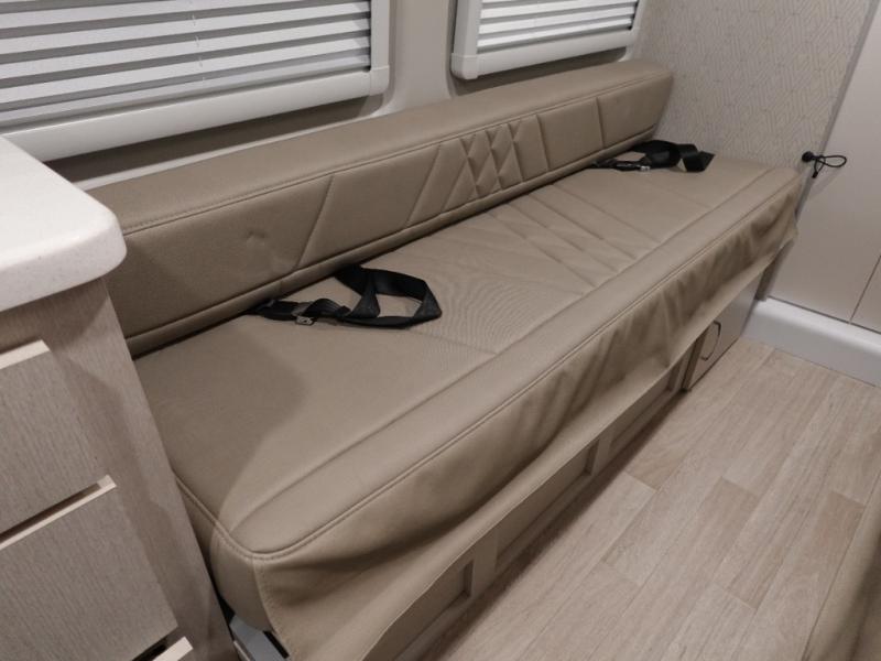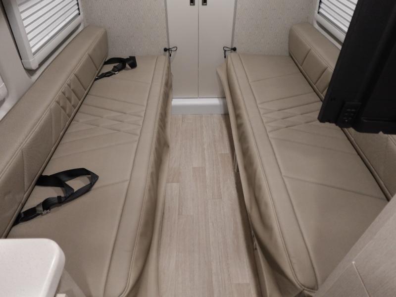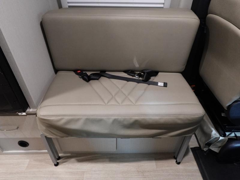 Whether you're traveling to the campground for the weekend or enjoying a day trip with friends, this coach is sure to fit your needs! There are a total of six seatbelts for day cruisers, and if you choose to stay the night, the wet bath is sure to come in handy. The twin sofa beds with a king bed conversion will provide a comfortable place to sleep each night, and your guest can sleep on the dinette with a pull-out sleeping area up front. There is also a portable table that can be moved in front of this dinette, or you can place it in between the twin sofa beds to play a game of cards. A single burner induction cooktop and microwave oven will let you make breakfast in the morning, and the single door 12V electric refrigerator will keep your cold items fresh. This coach also includes a closet by the refrigerator for snacks and a bath closet for clean towels; how convenient!