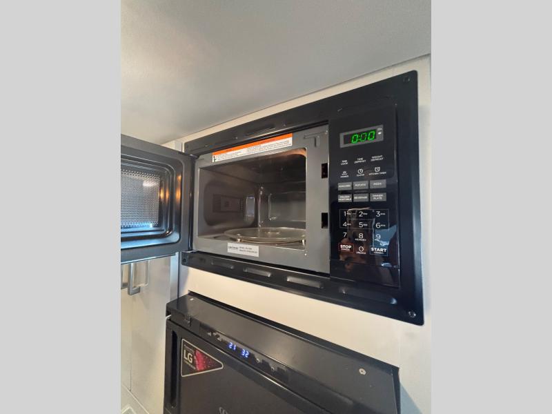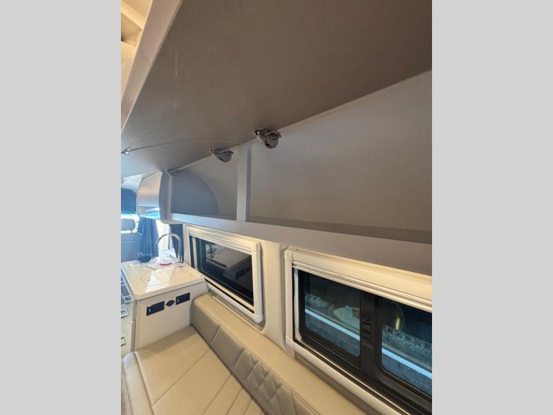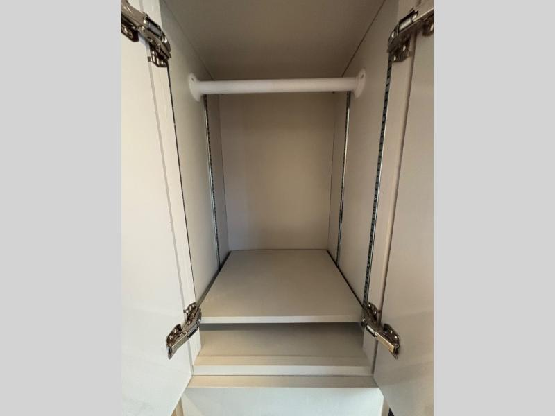 Whether you're traveling to the campground for the weekend or enjoying a day trip with friends, this coach is sure to fit your needs! There are a total of six seatbelts for day cruisers, and if you choose to stay the night, the wet bath is sure to come in handy. The twin sofa beds with a king bed conversion will provide a comfortable place to sleep each night, and your guest can sleep on the dinette with a pull-out sleeping area up front. There is also a portable table that can be moved in front of this dinette, or you can place it in between the twin sofa beds to play a game of cards. A single burner induction cooktop and microwave oven will let you make breakfast in the morning, and the single door 12V electric refrigerator will keep your cold items fresh. This coach also includes a closet by the refrigerator for snacks and a bath closet for clean towels; how convenient!