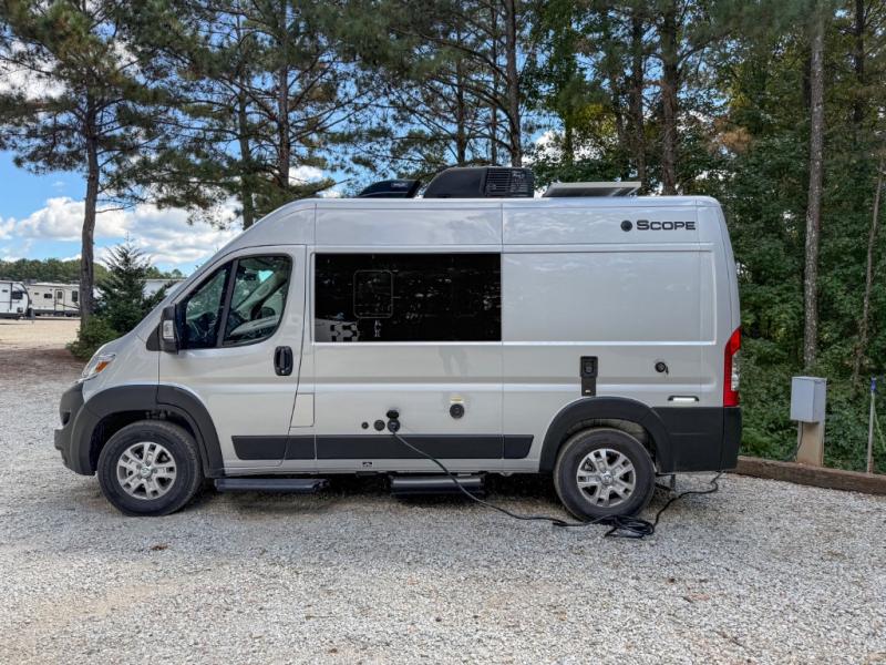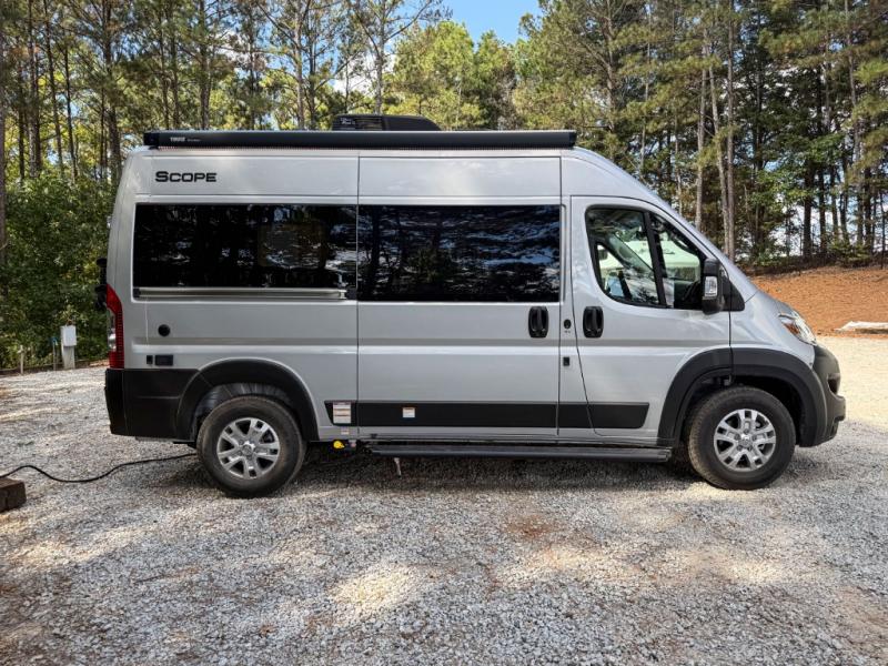 Each one of these Thor Motor Coach Scope Class B gas motorhomes are built for those who want to explore the great outdoors in comfort! They are front wheel drive and constructed with a RAM Promaster 1500 XT chassis, plus a 5,000 lb. trailer hitch with 4-pin connector so you can haul even more items with you. The side steps make it easier to enter and exit the units, and the entryway screen door is an added bonus. Each model includes Thule lateral arm power awning with LED lights, swivel captain's chairs, Euro-style upper cabinet doors, cassette shades, and solid surface countertops. And you're sure to stay powered up by the 1000-watt inverter, 2800 gas generator, and 30-amp detachable shoreline power cord!