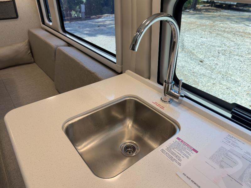 Modern Kitchenette: Cook on the go with a two-burner gas cooktop, convection microwave, solid surface countertops, stainless steel sink, and a 12V refrigerator.