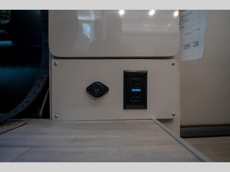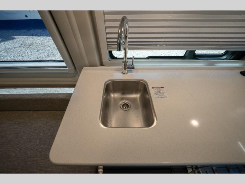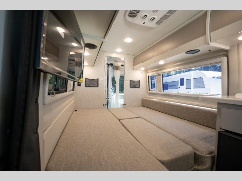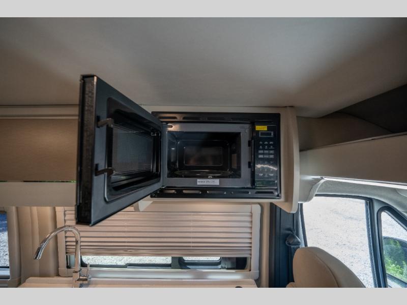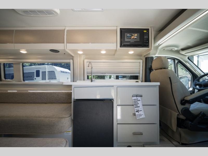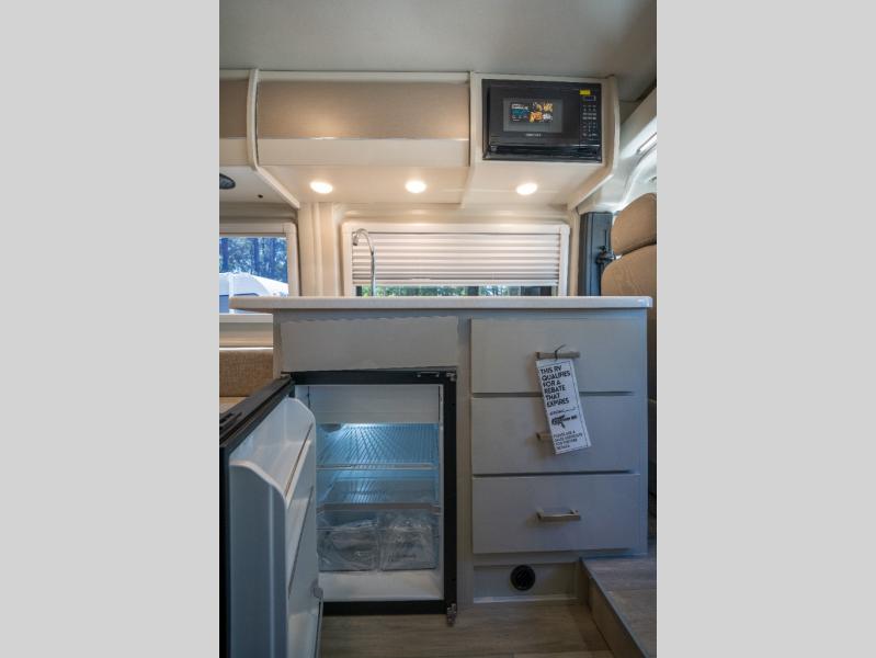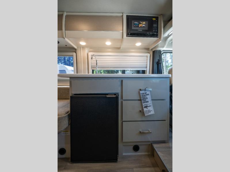 Travel the country with your favorite person in this motorhome! You can freshen up after a long day of traveling in the rear enclosed wet bath with a power vent fan to eliminate unwanted steam and a wardrobe with drawers to store your clothes and towels. Enjoy a good night's rest on the 74" x 80" expanding sleeper sofa once converted, and there is a removable table in between to dine at. The kitchen not only has a single burner induction cooktop, single door 12V refrigerator, and convection microwave, but also a flip-up countertop for more space. There are even large opening side windows to let in some fresh air and natural lighting!