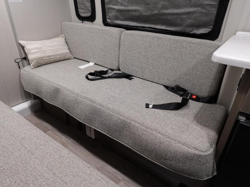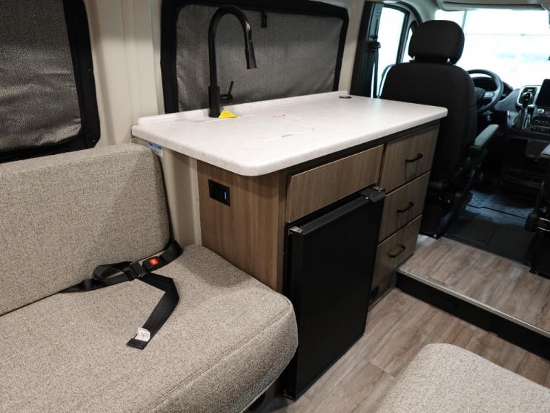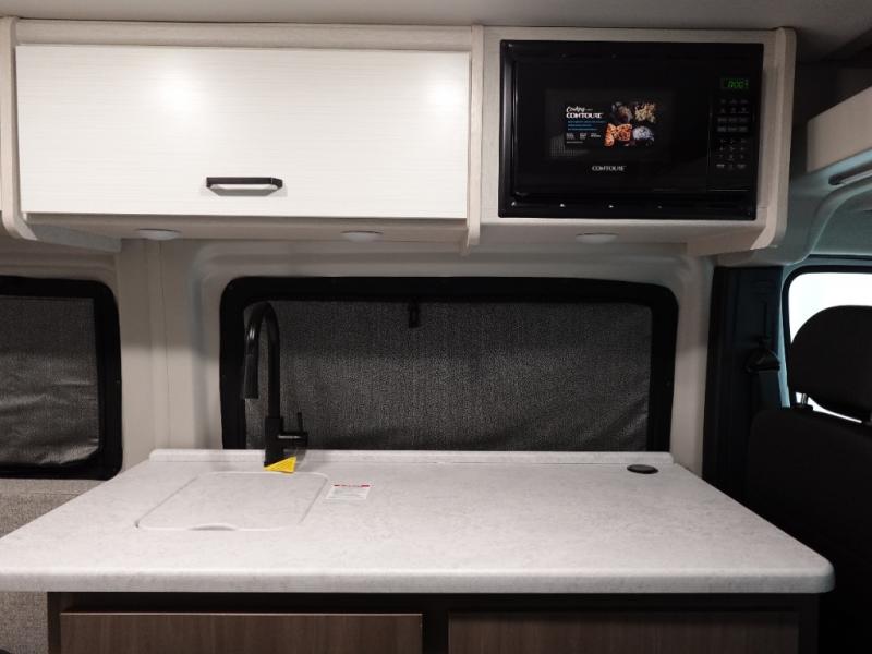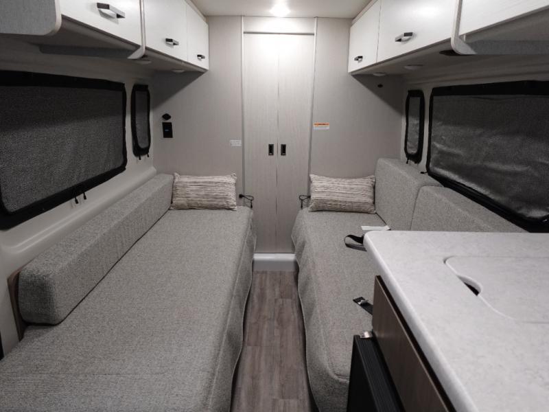 Travel the country with your favorite person in this motorhome! You can freshen up after a long day of traveling in the rear enclosed wet bath with a power vent fan to eliminate unwanted steam and a wardrobe with drawers to store your clothes and towels. Enjoy a good night's rest on the 74" x 80" expanding sleeper sofa once converted, and there is a removable table in between to dine at. The kitchen not only has a single burner induction cooktop, single door 12V refrigerator, and convection microwave, but also a flip-up countertop for more space. There are even large opening side windows to let in some fresh air and natural lighting!